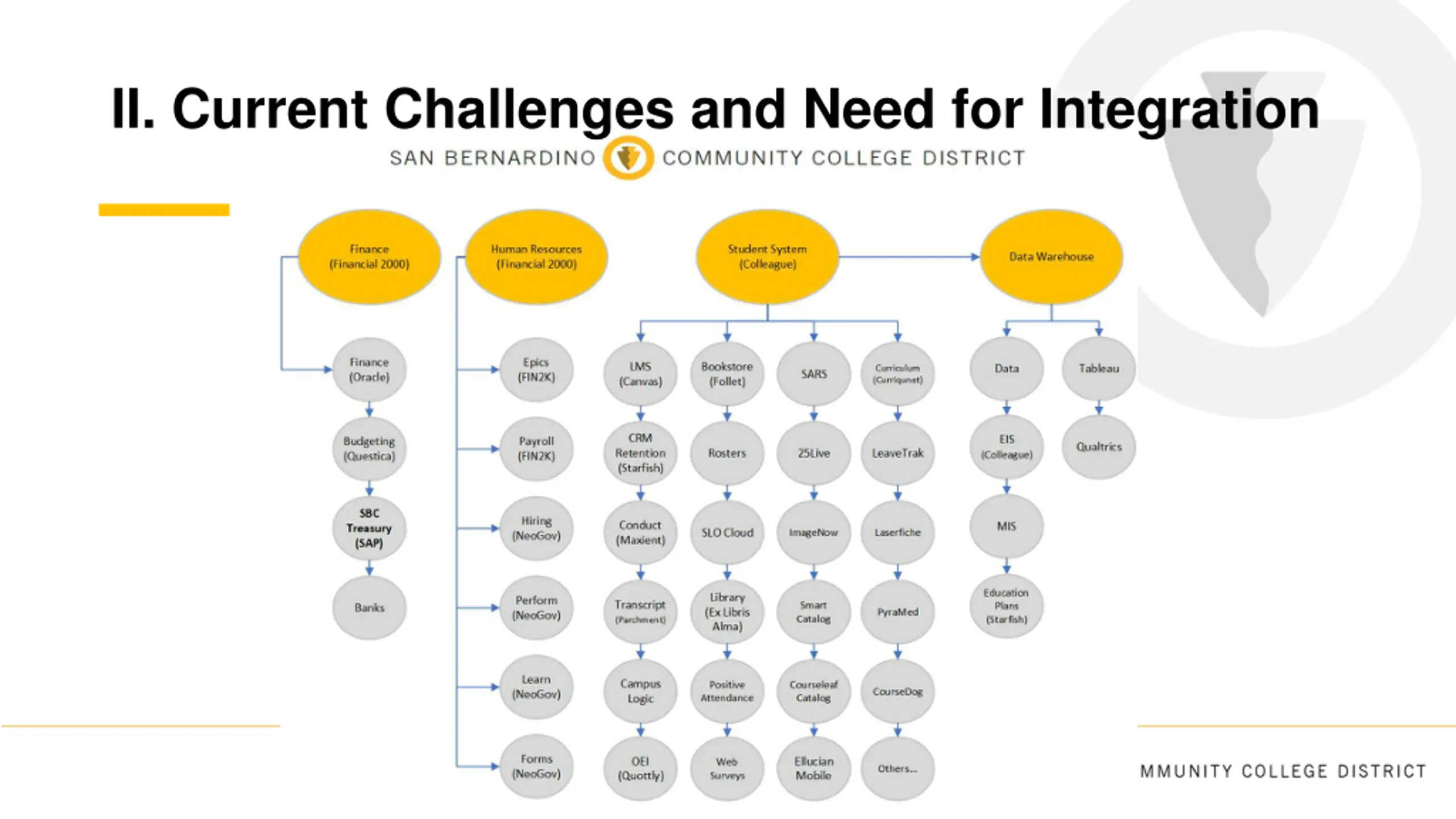 I. Integrated ERP Project Overview Unified Platform: The integrated ERP and Student Information System will provide a single, cohesive platform for managing all administrative processes, reducing complexity and improving efficiency. Improved User Experience: Students, faculty, and staff will benefit from a more streamlined and user-friendly interface, making it easier to navigate and complete tasks efficiently. Innovation The integrated system will enable us to leverage automated processes, AI, Machine Learning and Prodictive Analytics. Enhanced Collaboration: By integrating various departments and functions, the system will foster better collaboration and communication across the institution. Scalability: The new system will be designed to scale with the institution's growth, ensuring it can adapt to increasing demands and evolving educational needs. Data-Driven Decision Making: With access to comprehensive and integrated data, the institution will be able to make more informed decisions, driving strategic planning and operational improvements.