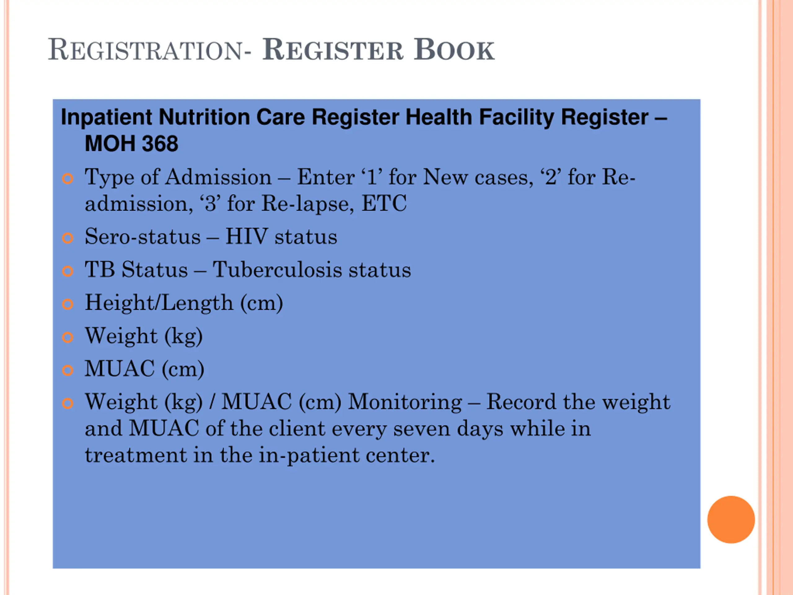 REGISTRATION- REGISTER BOOK Inpatient Nutrition Care Register Health Facility Register MOH 368 Type of Admission Enter 1 for New cases, 2 for Re- admission, 3 for Re-lapse, ETC Sero-status HIV status TB Status Tuberculosis status Height/Length (cm) Weight (kg) MUAC (cm) Weight (kg) / MUAC (cm) Monitoring Record the weight and MUAC of the client every seven days while in treatment in the in-patient center.