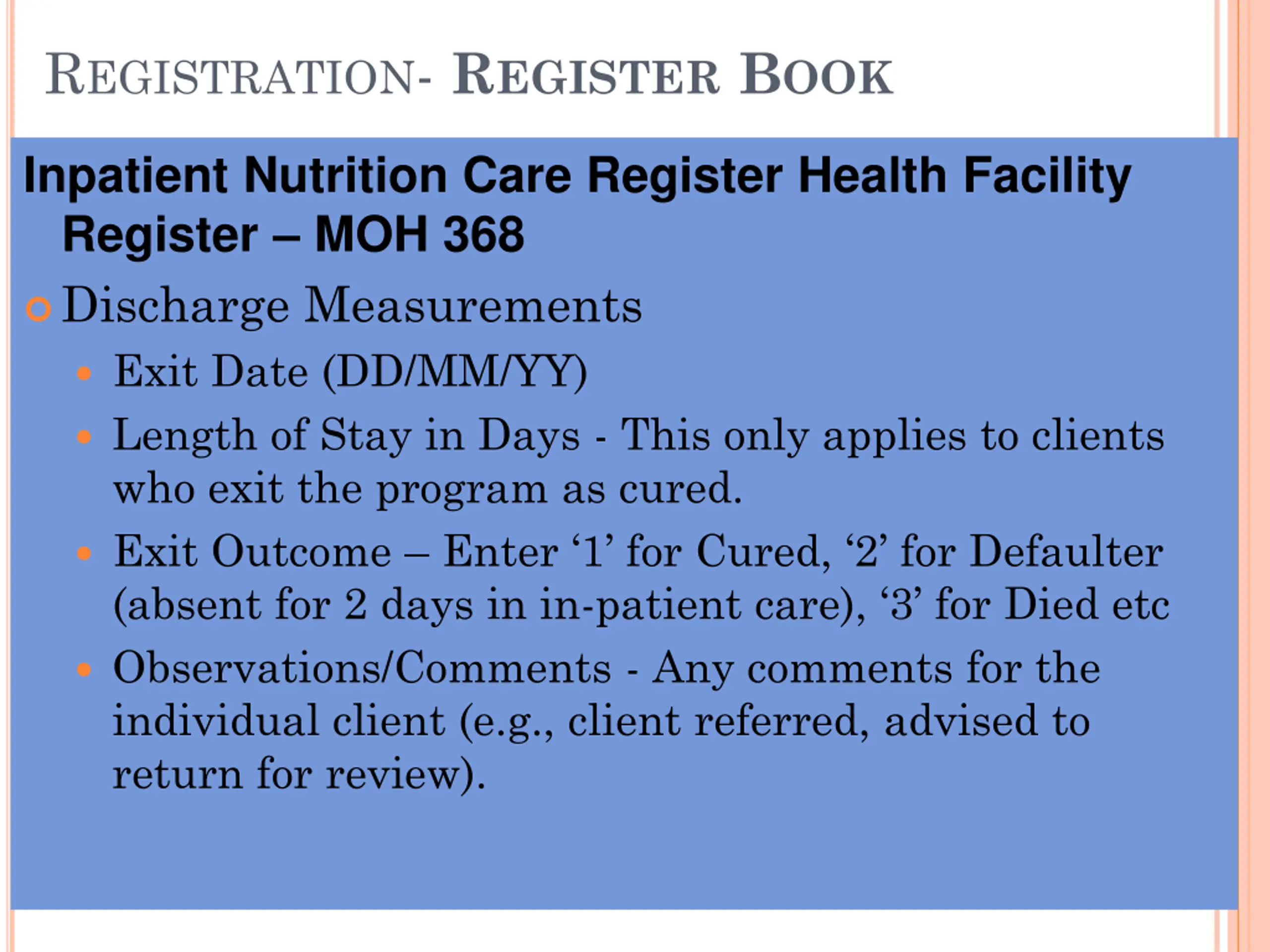REGISTRATION- REGISTER BOOK Inpatient Nutrition Care Register Health Facility Register MOH 368 Discharge Measurements Exit Date (DD/MM/YY) Length of Stay in Days - This only applies to clients who exit the program as cured. Exit Outcome Enter 1 for Cured, 2 for Defaulter (absent for 2 days in in-patient care), 3 for Died etc Observations/Comments - Any comments for the individual client (e.g., client referred, advised to return for review).