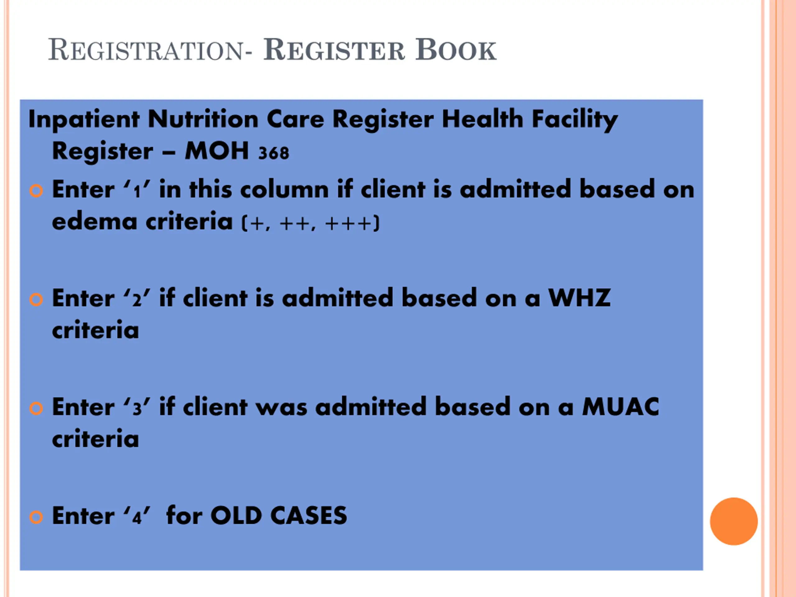 REGISTRATION- REGISTER BOOK Inpatient Nutrition Care Register Health Facility Register MOH 368 Enter 1 in this column if client is admitted based on edema criteria (+, ++, +++) Enter 2 if client is admitted based on a WHZ criteria Enter 3 if client was admitted based on a MUAC criteria Enter 4 for OLD CASES