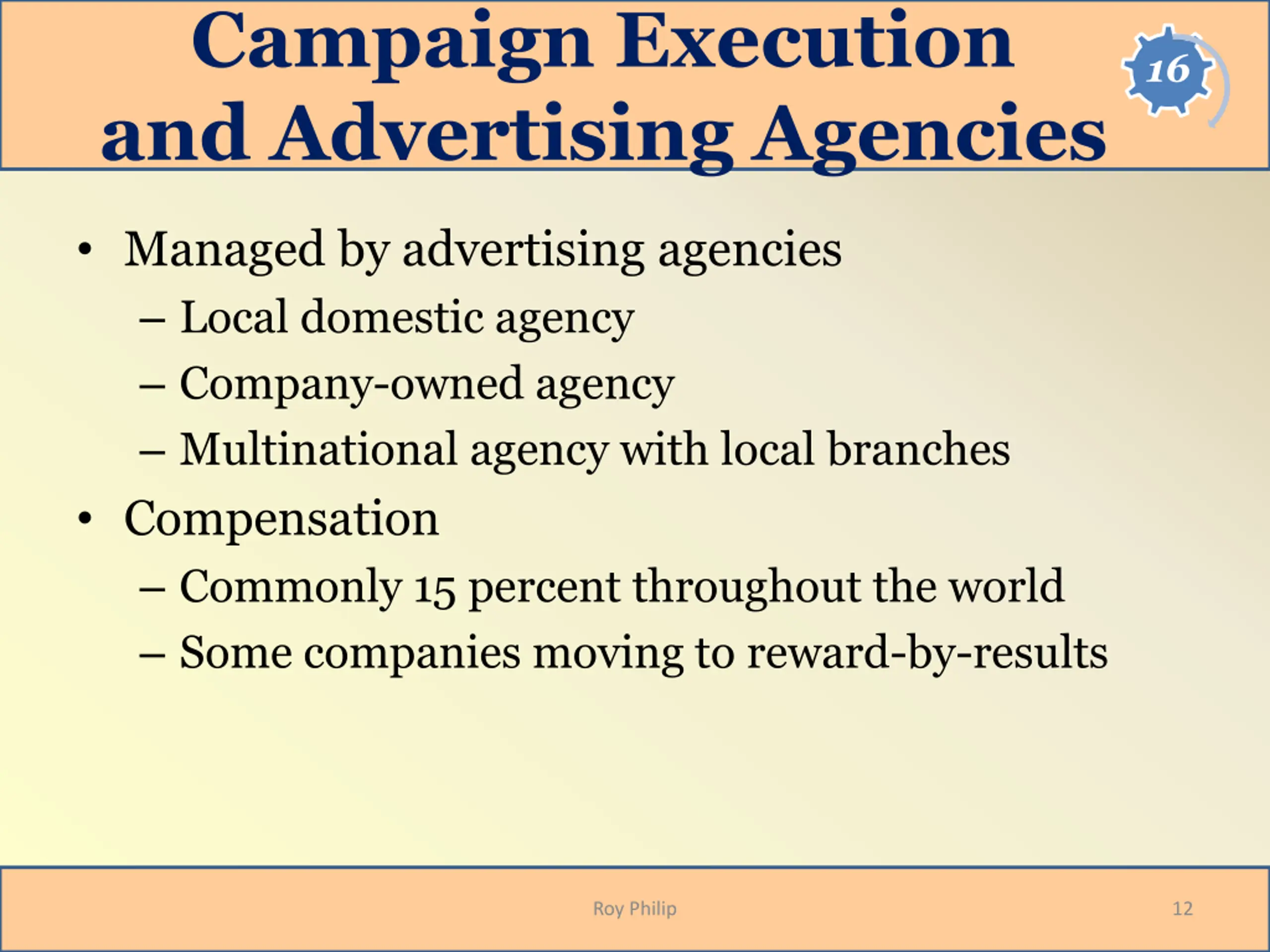Campaign Execution and Advertising Agencies 16 Managed by advertising agencies Local domestic agency Company-owned agency Multinational agency with local branches Compensation Commonly 15 percent throughout the world Some companies moving to reward-by-results Roy Philip 12