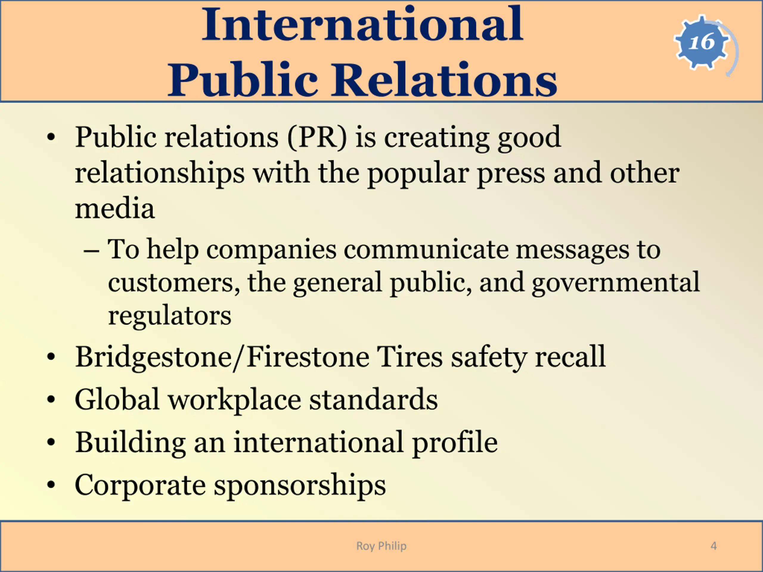 International Public Relations Public relations (PR)is creating good relationships with the popular press and other media To help companies communicate messages to customers, the general public, and governmental regulators Bridgestone/Firestone Tires safety recall Global workplace standards Building an international profile Corporate sponsorships 16 Roy Philip 4