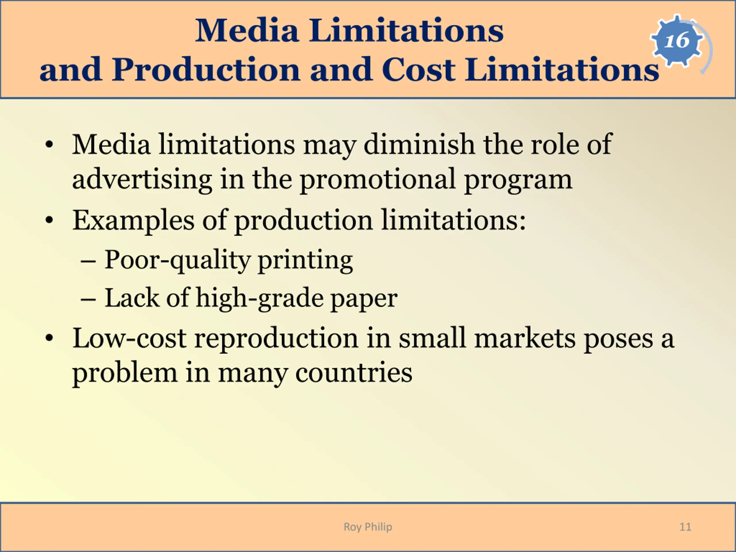 Media Limitations and Production and Cost Limitations 16 Media limitations may diminish the role of advertising in the promotional program Examples of production limitations: Poor-quality printing Lack of high-grade paper Low-cost reproduction in small markets poses a problem in many countries Roy Philip 11