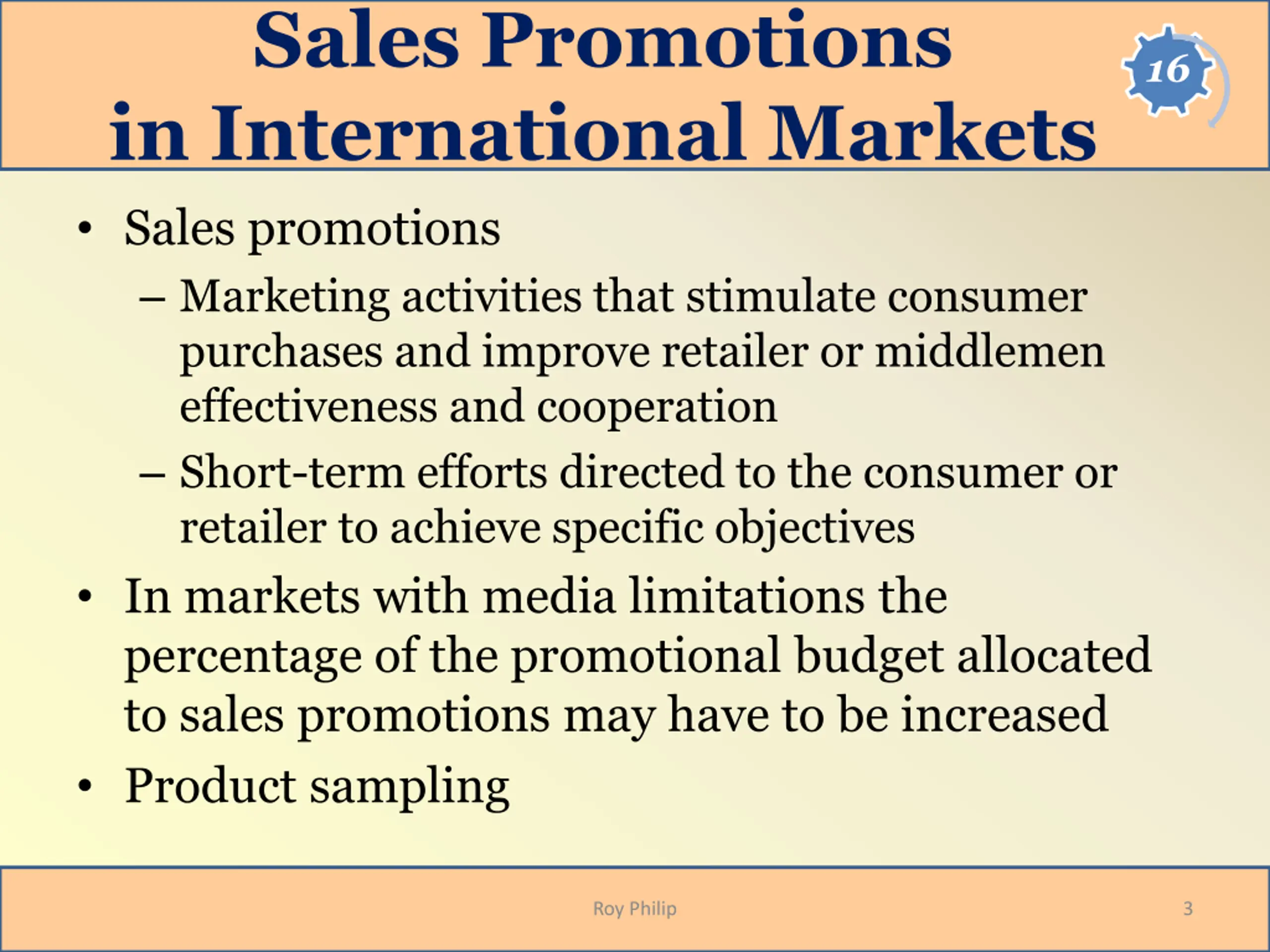 Sales Promotions in International Markets Sales promotions Marketing activities that stimulate consumer purchases and improve retailer or middlemen effectiveness and cooperation Short-term efforts directed to the consumer or retailer to achieve specific objectives In markets with media limitations the percentage of the promotional budget allocated to sales promotions may have to be increased Product sampling 16 Roy Philip 3