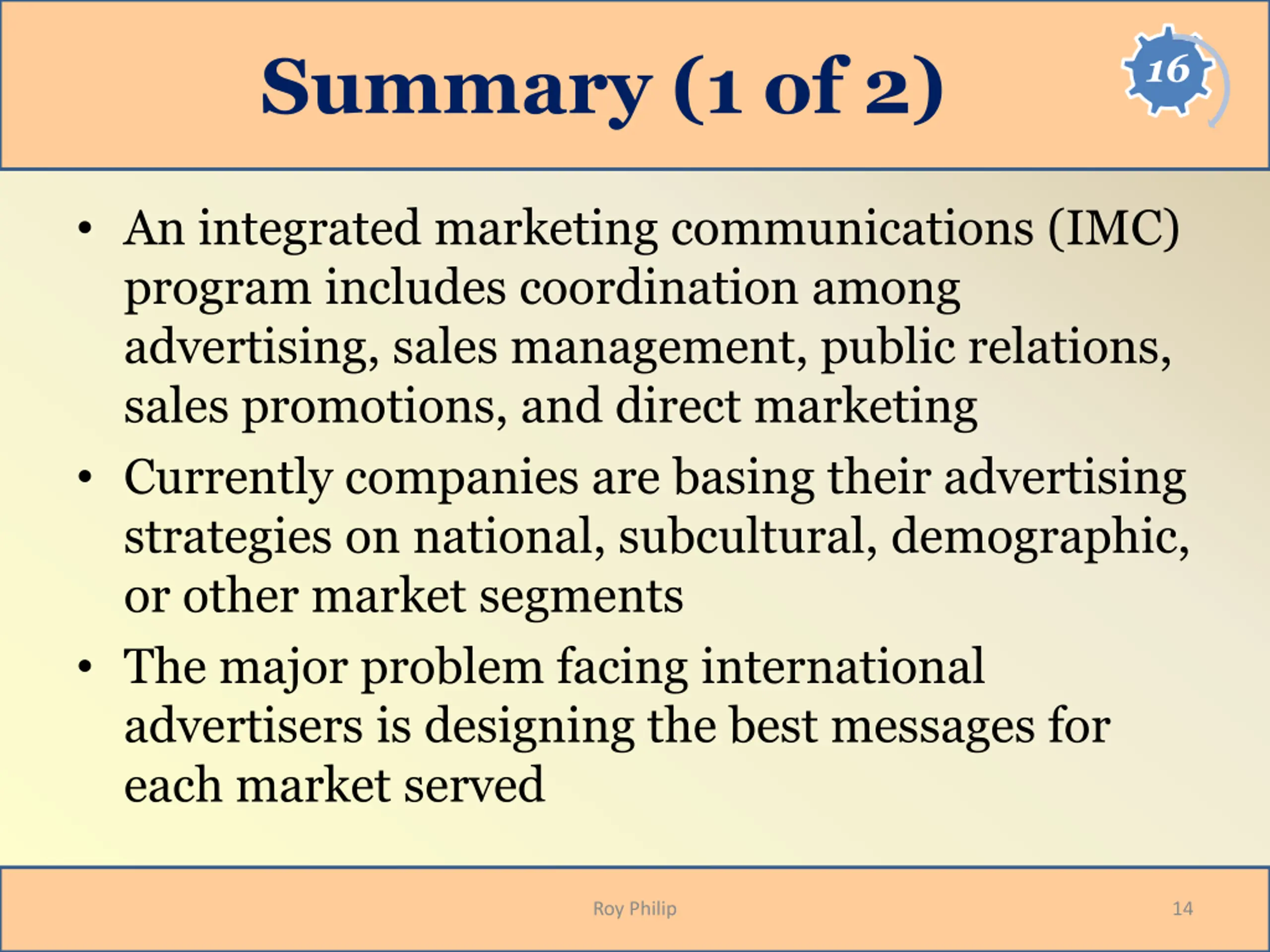 Summary (1 of 2) 16 An integrated marketing communications (IMC) program includes coordination among advertising, sales management, public relations, sales promotions, and direct marketing Currently companies are basing their advertising strategies on national, subcultural, demographic, or other market segments The major problem facing international advertisers is designing the best messages for each market served Roy Philip 14