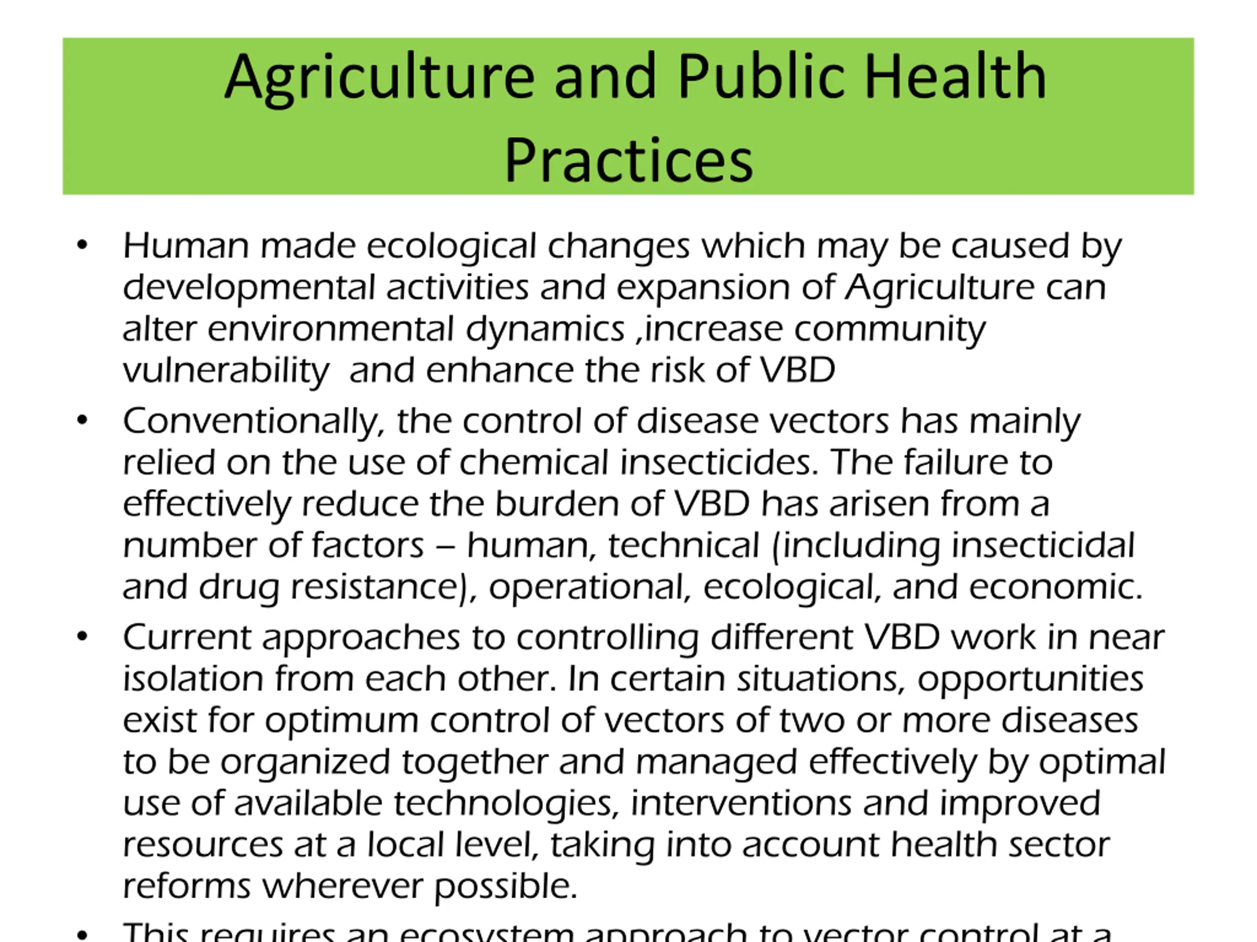 Agriculture and Public Health Practices Human made ecological changes which may be caused by developmental activities and expansion of Agriculture can alter environmental dynamics ,increase community vulnerability and enhance the risk of VBD Conventionally, the control of disease vectors has mainly relied on the use of chemical insecticides. The failure to effectively reduce the burden of VBD has arisen from a number of factors human, technical (including insecticidal and drug resistance), operational, ecological, and economic. Current approaches to controlling different VBD work in near isolation from each other. In certain situations, opportunities exist for optimum control of vectors of two or more diseases to be organized together and managed effectively by optimal use of available technologies, interventions and improved resources at a local level, taking into account health sector reforms wherever possible. This requires an ecosystem approach to vector control at a