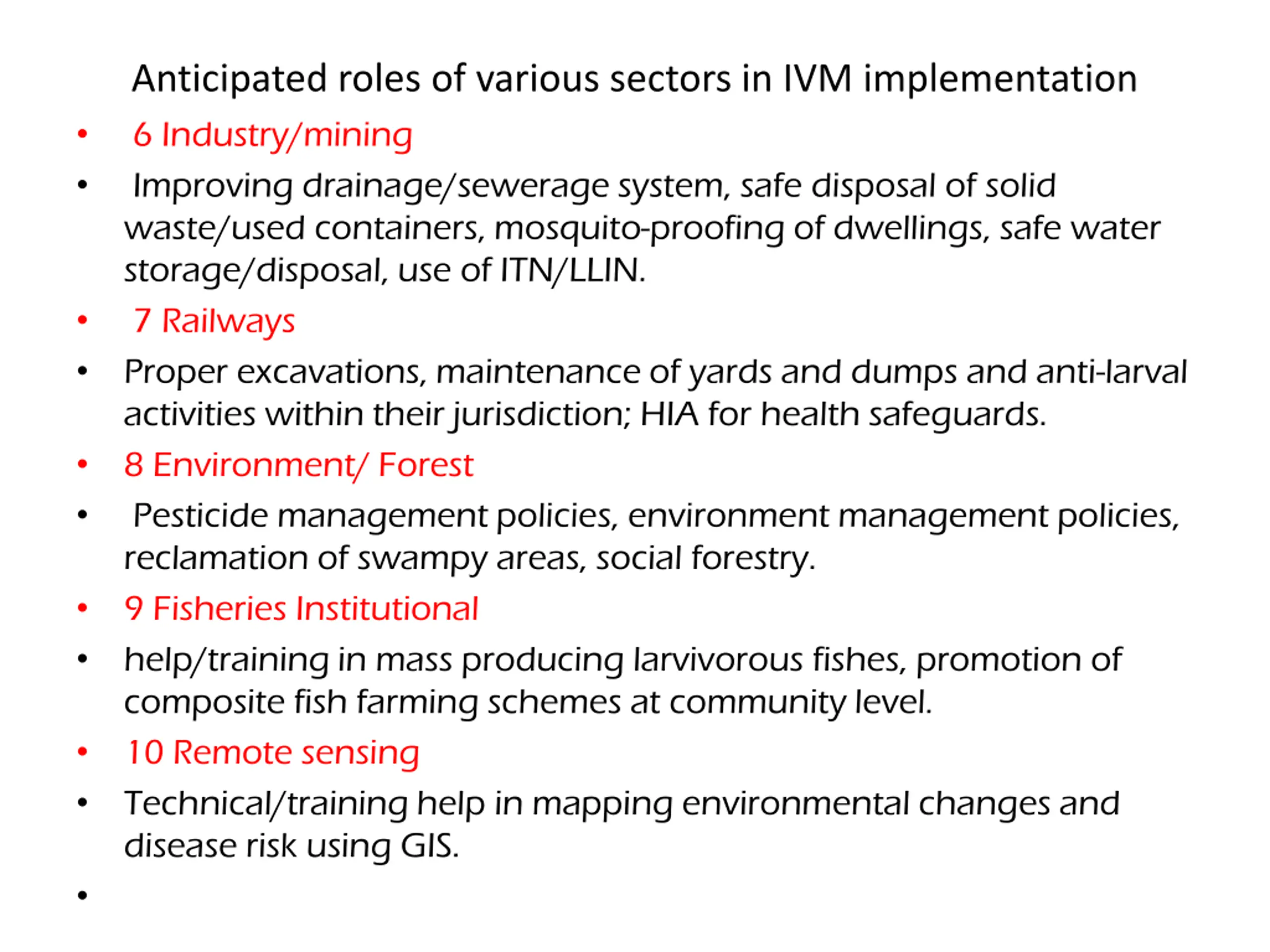 Anticipated roles of various sectors in IVM implementation 6 Industry/mining Improving drainage/sewerage system, safe disposal of solid waste/used containers, mosquito-proofing of dwellings, safe water storage/disposal, use of ITN/LLIN. 7 Railways Proper excavations, maintenance of yards and dumps and anti-larval activities within their jurisdiction; HIA for health safeguards. 8 Environment/ Forest Pesticide management policies, environment management policies, reclamation of swampy areas, social forestry. 9 Fisheries Institutional help/training in mass producing larvivorous fishes, promotion of composite fish farming schemes at community level. 10 Remote sensing Technical/training help in mapping environmental changes and disease risk using GIS.