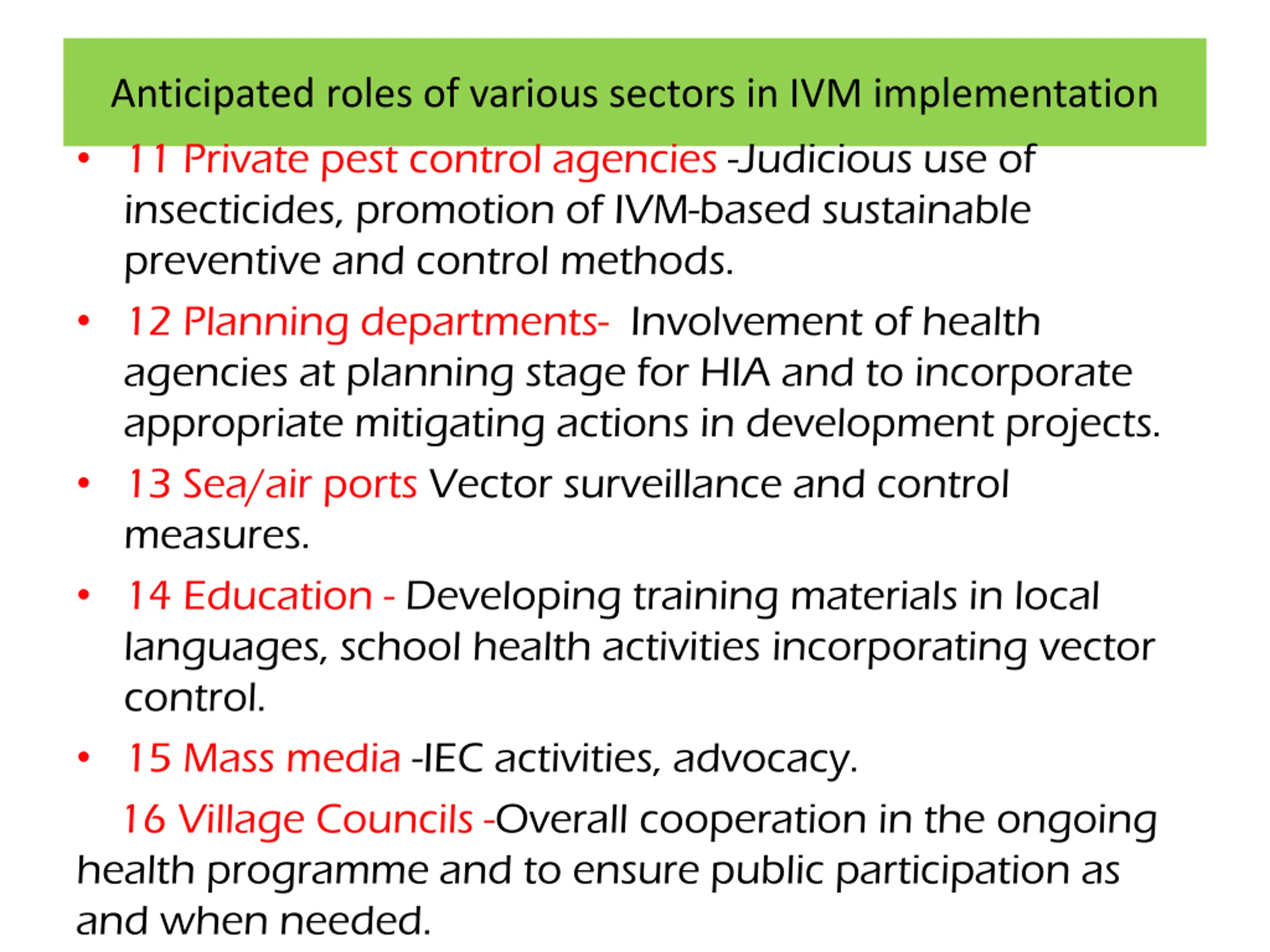 Anticipated roles of various sectors in IVM implementation 11 Private pest control agencies -Judicious use of insecticides, promotion of IVM-based sustainable preventive and control methods. 12 Planning departments- Involvement of health agencies at planning stage for HIA and to incorporate appropriate mitigating actions in development projects. 13 Sea/air ports Vector surveillance and control measures. 14 Education - Developing training materials in local languages, school health activities incorporating vector control. 15 Mass media -IEC activities, advocacy. 16 Village Councils -Overall cooperation in the ongoing health programme and to ensure public participation as and when needed.