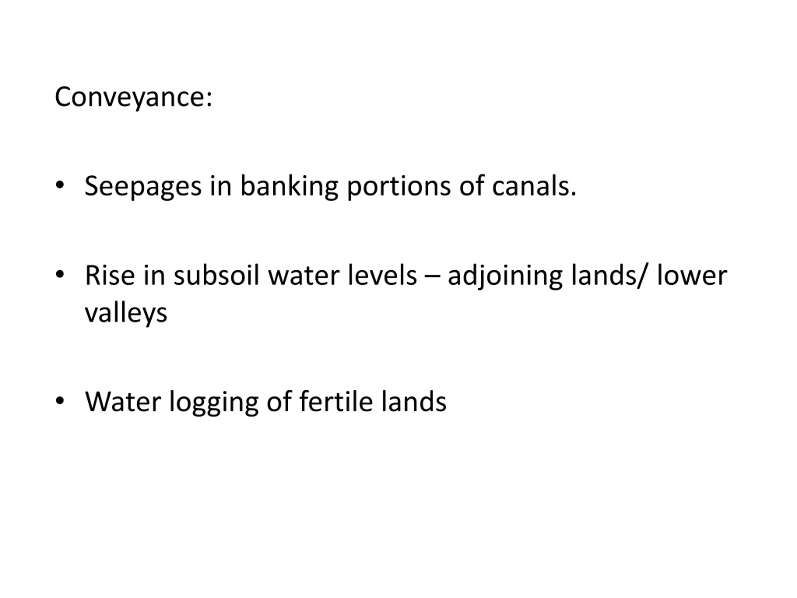 Conveyance: Seepages in banking portions of canals. Rise in subsoil water levels adjoining lands/ lower valleys Water logging of fertile lands