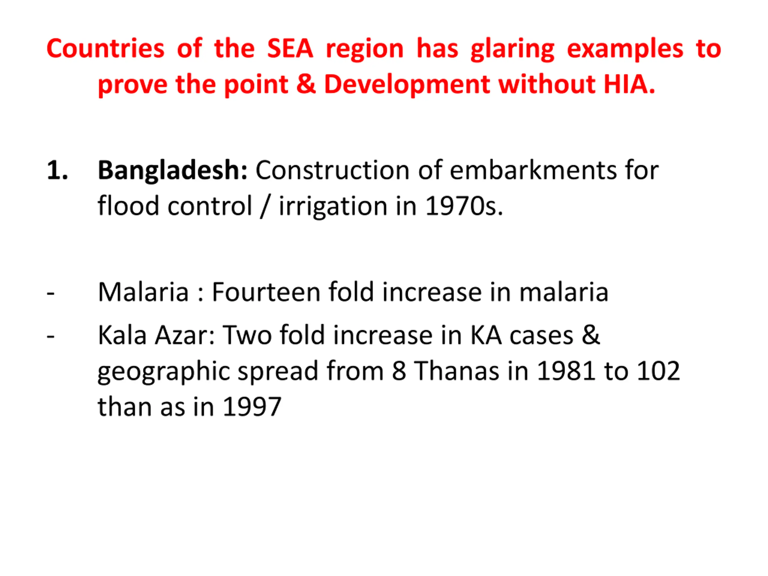 Countries of the SEA region has glaring examples to prove the point & Development without HIA. 1. Bangladesh: Construction of embarkments for flood control / irrigation in 1970s. - - Malaria : Fourteen fold increase in malaria Kala Azar: Two fold increase in KA cases & geographic spread from 8 Thanas in 1981 to 102 than as in 1997