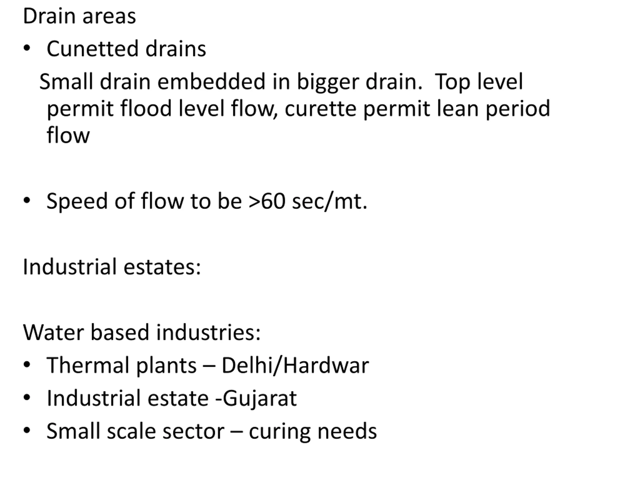 Drain areas Cunetted drains Small drain embedded in bigger drain. Top level permit flood level flow, curette permit lean period flow Speed of flow to be >60 sec/mt. Industrial estates: Water based industries: Thermal plants Delhi/Hardwar Industrial estate -Gujarat Small scale sector curing needs