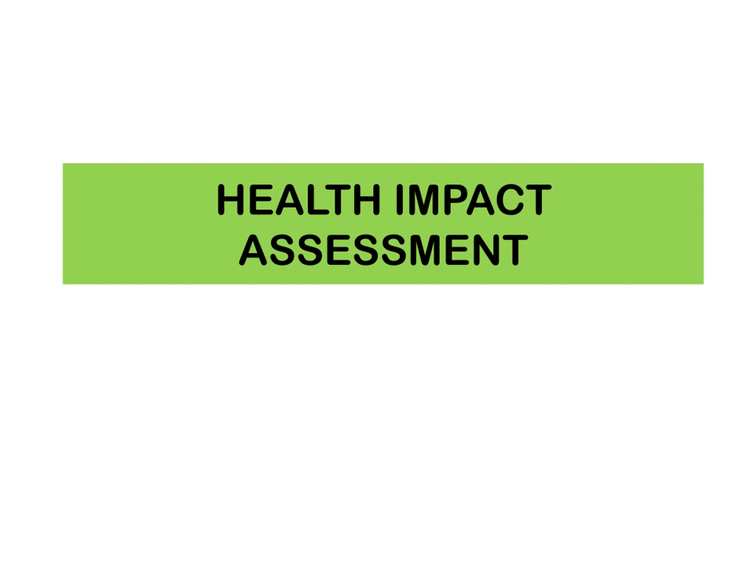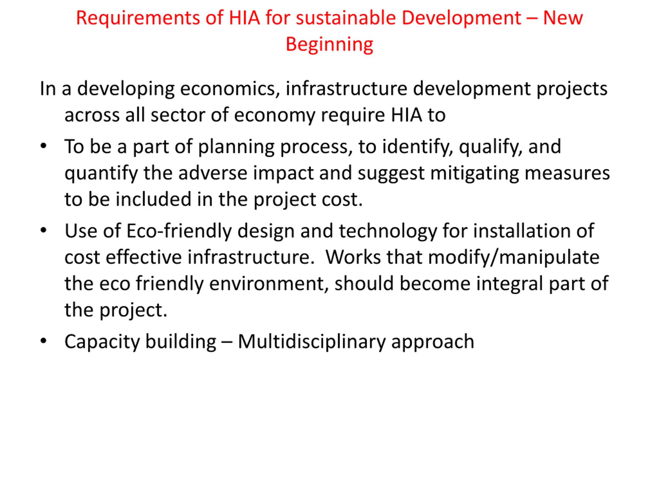 Requirements of HIA for sustainable Development New Beginning In a developing economics, infrastructure development projects across all sector of economy require HIA to To be a part of planning process, to identify, qualify, and quantify the adverse impact and suggest mitigating measures to be included in the project cost. Use of Eco-friendly design and technology for installation of cost effective infrastructure. Works that modify/manipulate the eco friendly environment, should become integral part of the project. Capacity building Multidisciplinary approach