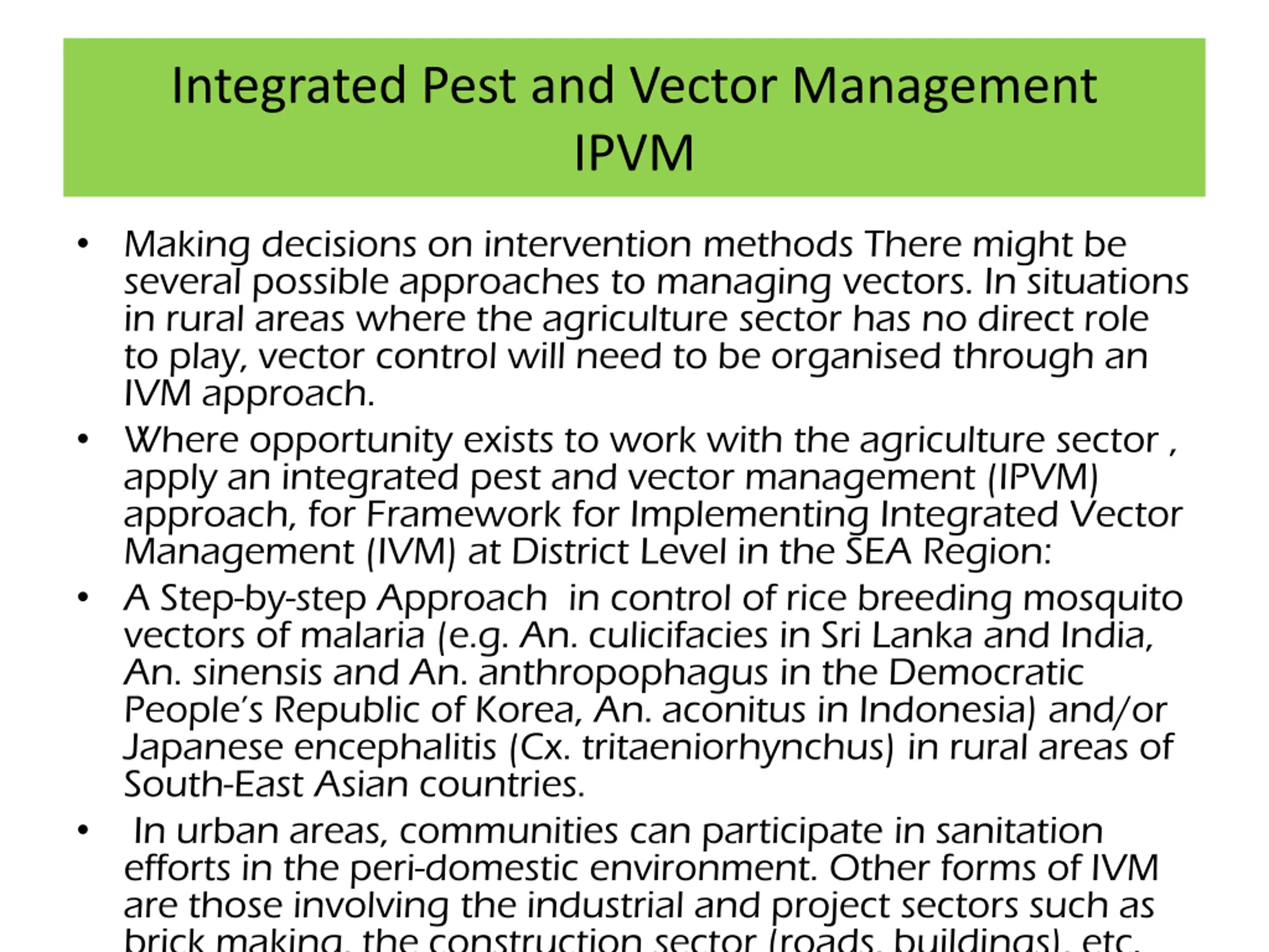 Integrated Pest and Vector Management IPVM Making decisions on intervention methods There might be several possible approaches to managing vectors. In situations in rural areas where the agriculture sector has no direct role to play, vector control will need to be organised through an IVM approach. Where opportunity exists to work with the agriculture sector , apply an integrated pest and vector management (IPVM) approach, for Framework for Implementing Integrated Vector Management (IVM) at District Level in the SEA Region: A Step-by-step Approach in control of rice breeding mosquito vectors of malaria (e.g. An. culicifacies in Sri Lanka and India, An. sinensis and An. anthropophagus in the Democratic People s Republic of Korea, An. aconitus in Indonesia) and/or Japanese encephalitis (Cx. tritaeniorhynchus) in rural areas of South-East Asian countries. In urban areas, communities can participate in sanitation efforts in the peri-domestic environment. Other forms of IVM are those involving the industrial and project sectors such as brick making, the construction sector (roads, buildings), etc.
