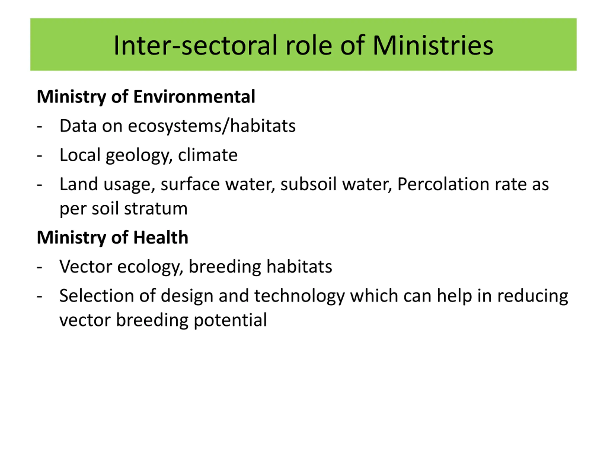 Inter-sectoral role of Ministries Ministry of Environmental - Data on ecosystems/habitats - Local geology, climate - Land usage, surface water, subsoil water, Percolation rate as per soil stratum Ministry of Health - Vector ecology, breeding habitats - Selection of design and technology which can help in reducing vector breeding potential