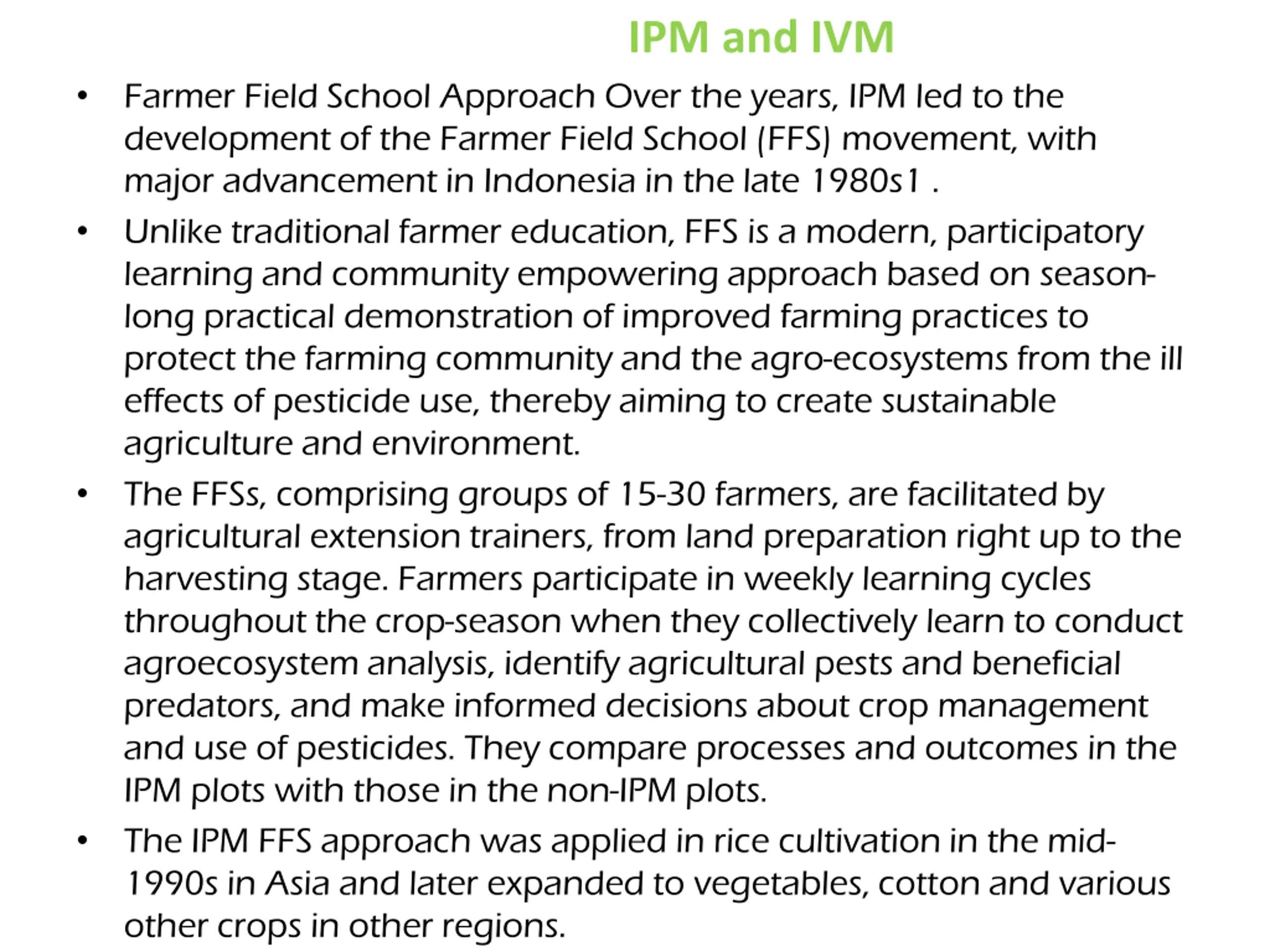 IPM and IVM Farmer Field School Approach Over the years, IPM led to the development of the Farmer Field School (FFS) movement, with major advancement in Indonesia in the late 1980s1 . Unlike traditional farmer education, FFS is a modern, participatory learning and community empowering approach based on season- long practical demonstration of improved farming practices to protect the farming community and the agro-ecosystems from the ill effects of pesticide use, thereby aiming to create sustainable agriculture and environment. The FFSs, comprising groups of 15-30 farmers, are facilitated by agricultural extension trainers, from land preparation right up to the harvesting stage. Farmers participate in weekly learning cycles throughout the crop-season when they collectively learn to conduct agroecosystem analysis, identify agricultural pests and beneficial predators, and make informed decisions about crop management and use of pesticides. They compare processes and outcomes in the IPM plots with those in the non-IPM plots. The IPM FFS approach was applied in rice cultivation in the mid- 1990s in Asia and later expanded to vegetables, cotton and various other crops in other regions.