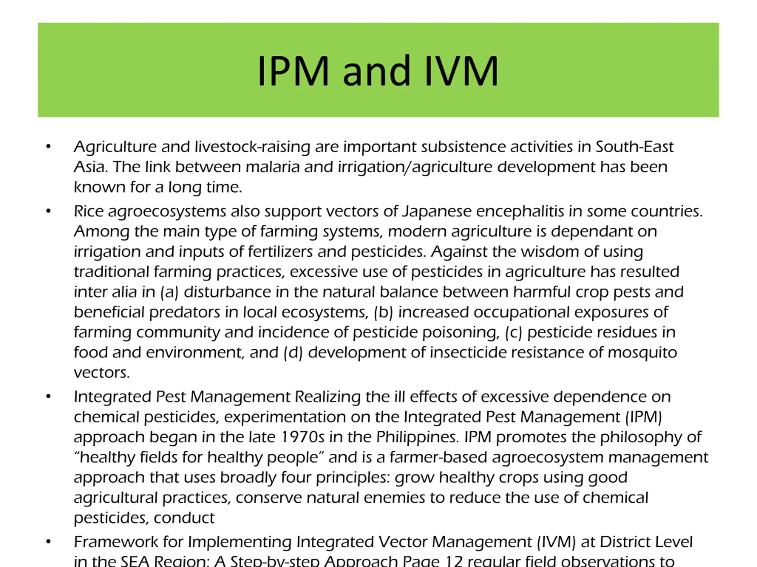 IPM and IVM Agriculture and livestock-raising are important subsistence activities in South-East Asia. The link between malaria and irrigation/agriculture development has been known for a long time. Rice agroecosystems also support vectors of Japanese encephalitis in some countries. Among the main type of farming systems, modern agriculture is dependant on irrigation and inputs of fertilizers and pesticides. Against the wisdom of using traditional farming practices, excessive use of pesticides in agriculture has resulted inter alia in (a) disturbance in the natural balance between harmful crop pests and beneficial predators in local ecosystems, (b) increased occupational exposures of farming community and incidence of pesticide poisoning, (c) pesticide residues in food and environment, and (d) development of insecticide resistance of mosquito vectors. Integrated Pest Management Realizing the ill effects of excessive dependence on chemical pesticides, experimentation on the Integrated Pest Management (IPM) approach began in the late 1970s in the Philippines. IPM promotes the philosophy of healthy fields for healthy people and is a farmer-based agroecosystem management approach that uses broadly four principles: grow healthy crops using good agricultural practices, conserve natural enemies to reduce the use of chemical pesticides, conduct Framework for Implementing Integrated Vector Management (IVM) at District Level in the SEA Region: A Step-by-step Approach Page 12 regular field observations to