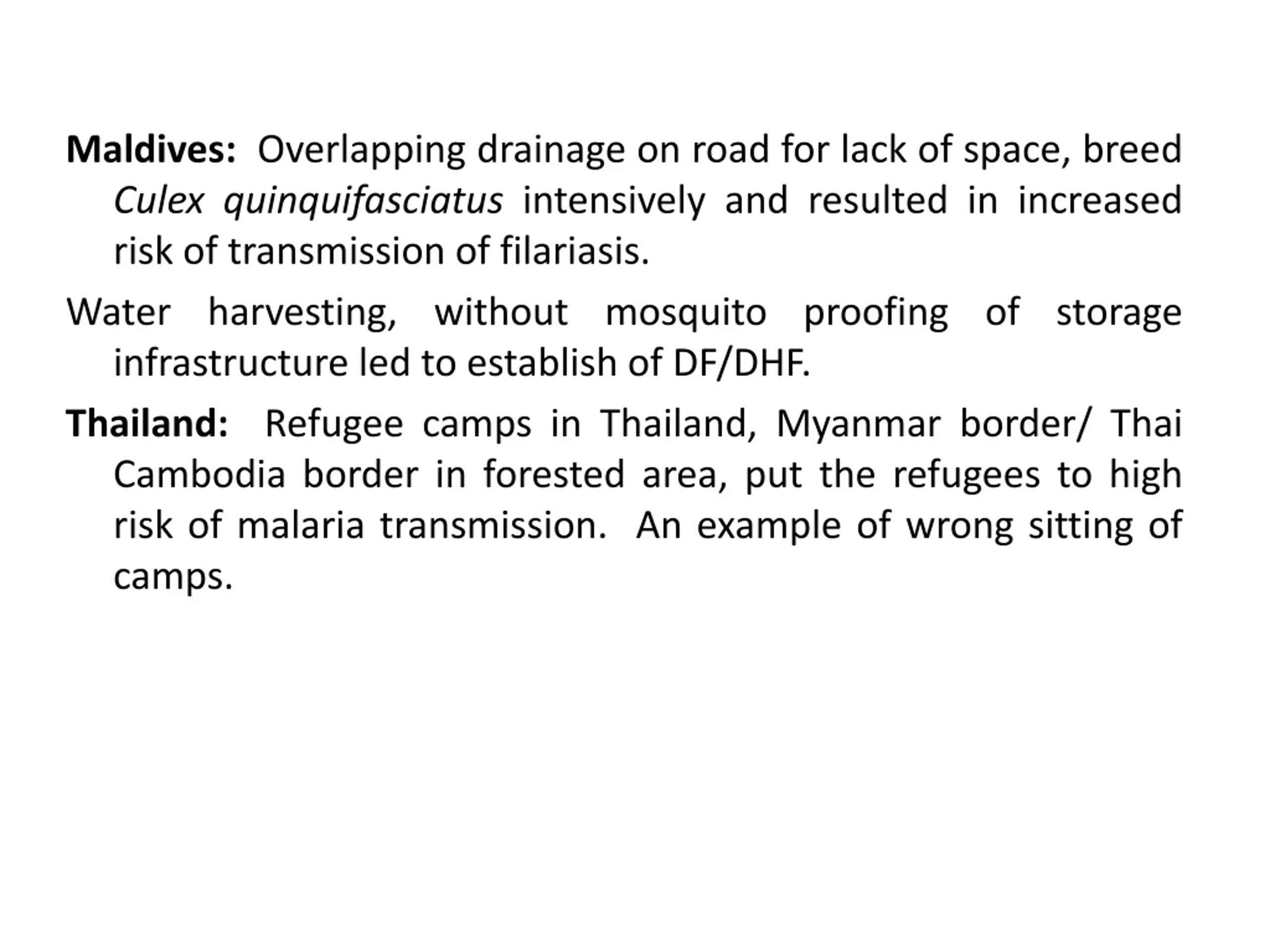 Maldives: Overlapping drainage on road for lack of space, breed Culex quinquifasciatus intensively and resulted in increased risk of transmission of filariasis. Water harvesting, without mosquito proofing of storage infrastructure led to establish of DF/DHF. Thailand: Refugee camps in Thailand, Myanmar border/ Thai Cambodia border in forested area, put the refugees to high risk of malaria transmission. An example of wrong sitting of camps.