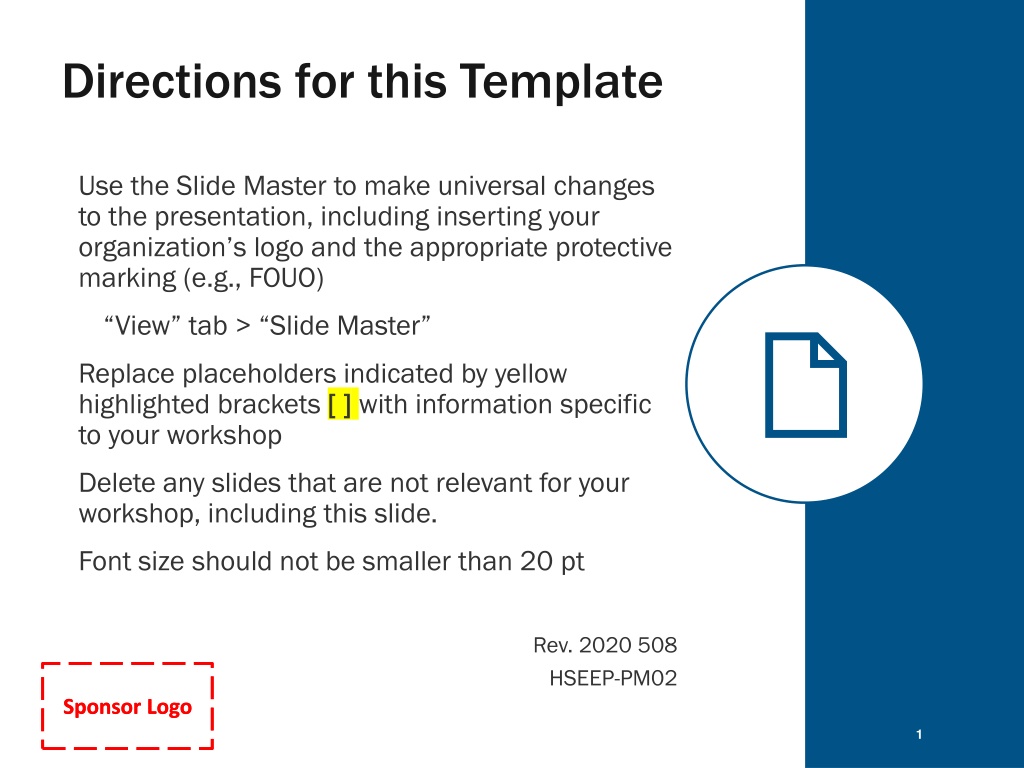 Directions for this Template Use the Slide Master to make universal changes to the presentation, including inserting your organization s logo and the appropriate protective marking (e.g., FOUO) View tab > Slide Master Replace placeholders indicated by yellow highlighted brackets [ ] [ ] with information specific to your workshop Delete any slides that are not relevant for your workshop, including this slide. Font size should not be smaller than 20 pt Rev. 2020 508 HSEEP-PM02 Sponsor Logo Sponsor Logo 1