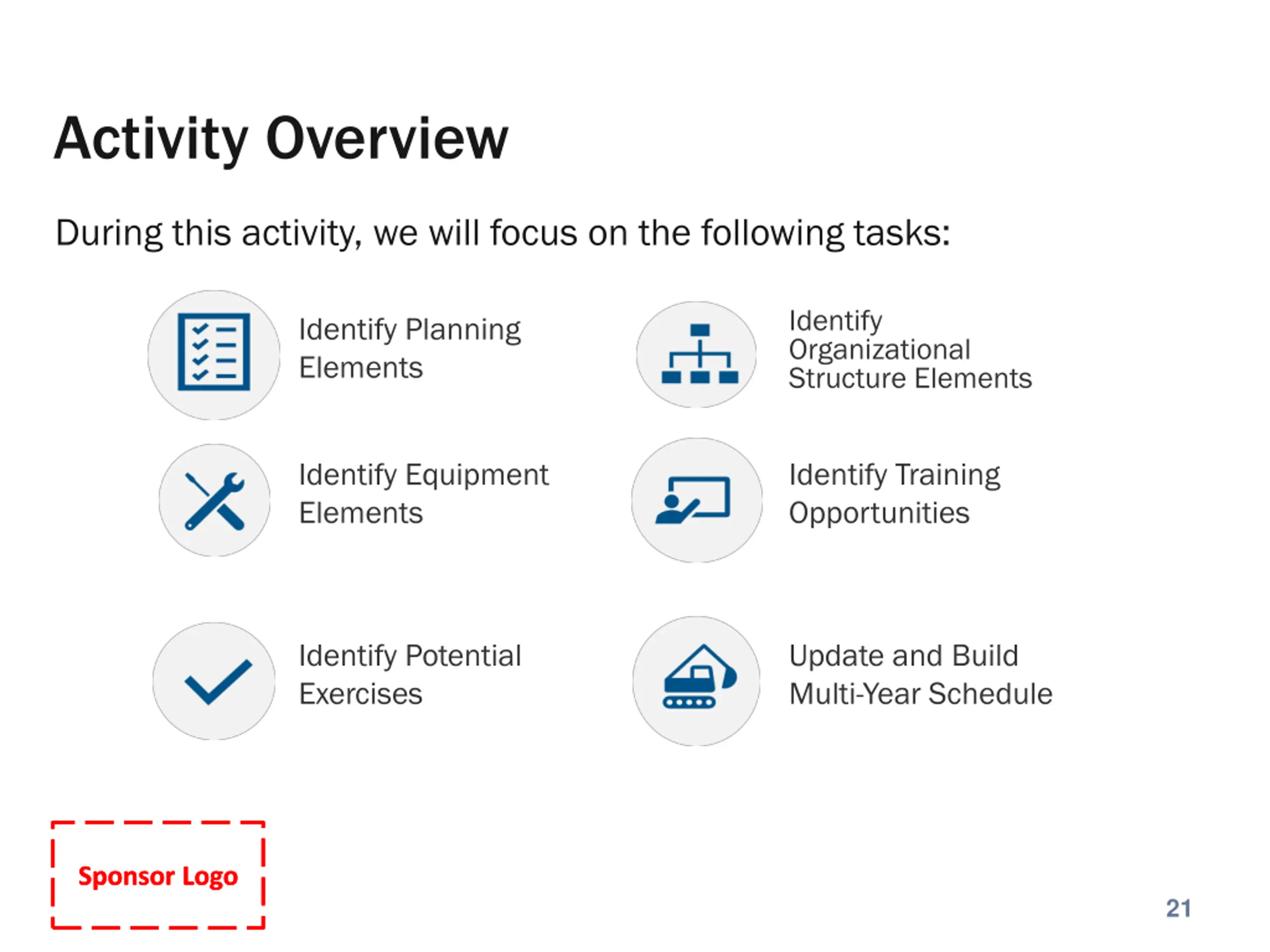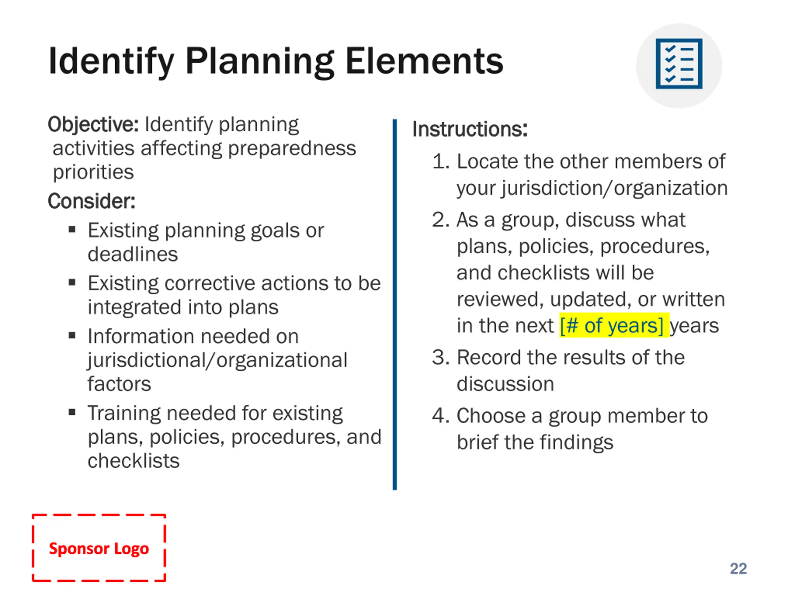 Activity Overview During this activity, we will focus on the following tasks: Identify Organizational Structure Elements Identify Planning Elements Identify Equipment Elements Identify Training Opportunities Identify Potential Exercises Update and Build Multi-Year Schedule Sponsor Logo Sponsor Logo 21
