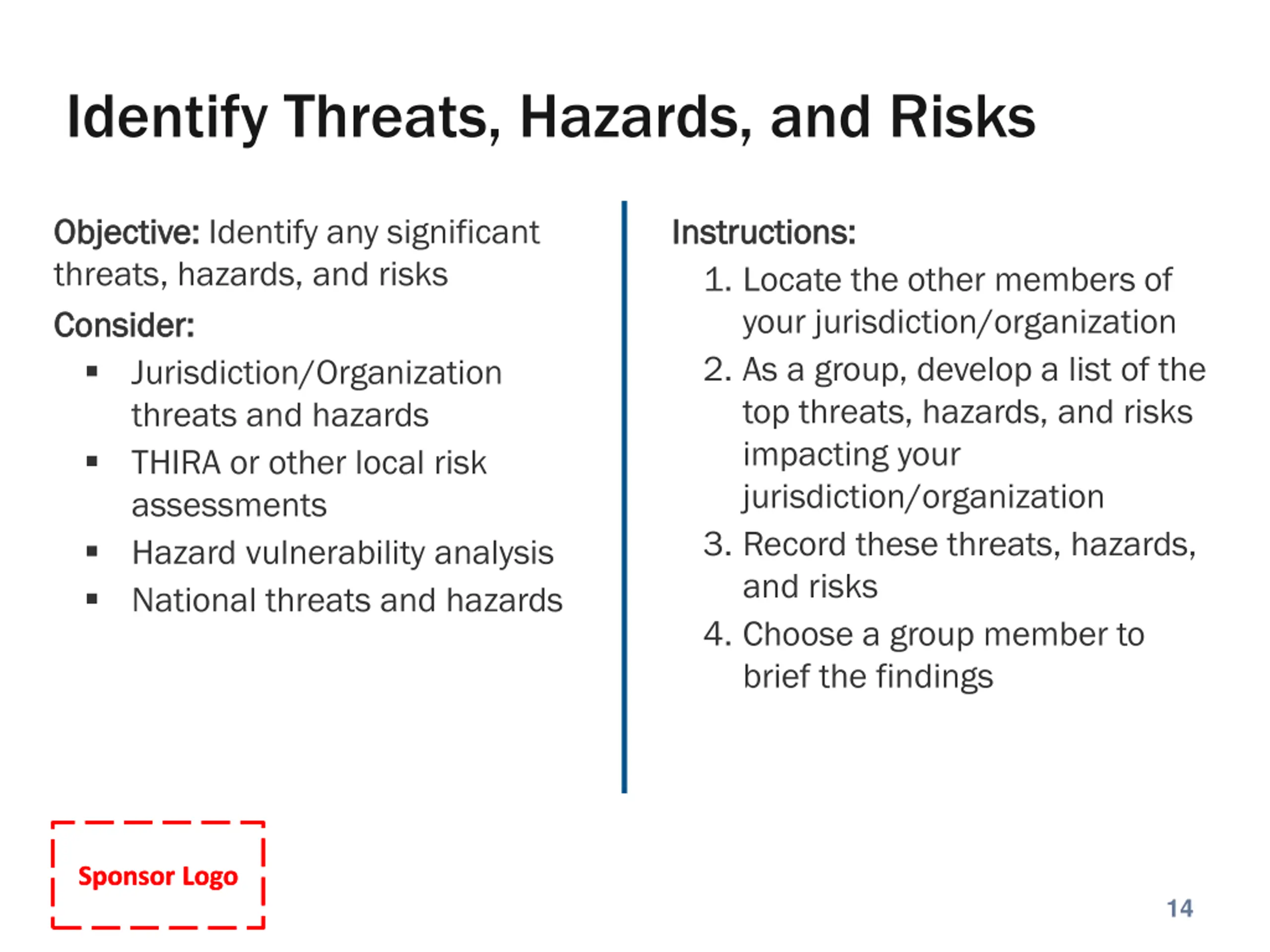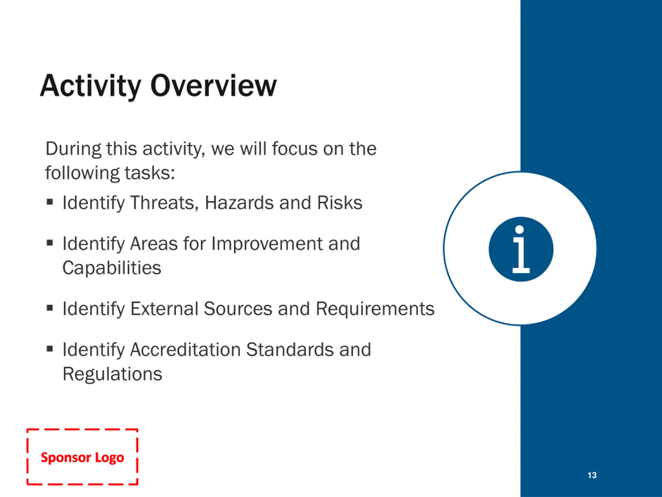Activity Overview During this activity, we will focus on the following tasks: Identify Threats, Hazards and Risks Identify Areas for Improvement and Capabilities Identify External Sources and Requirements Identify Accreditation Standards and Regulations Sponsor Logo Sponsor Logo 13