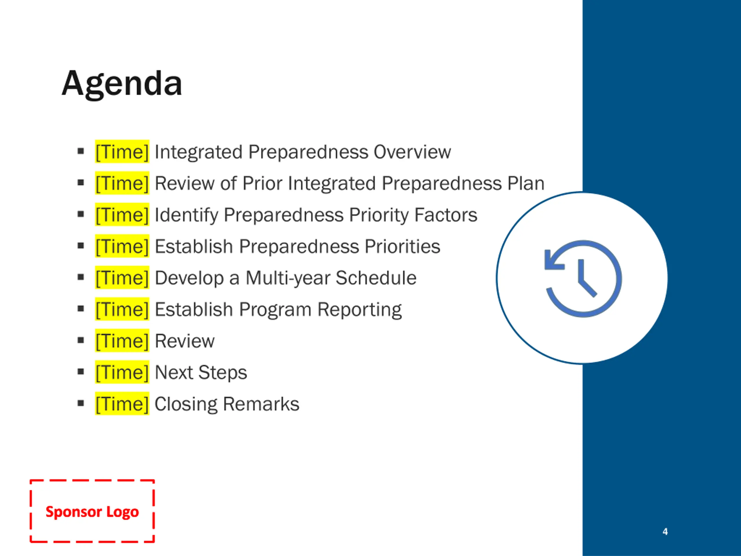 Agenda [Time] Integrated Preparedness Overview [Time] Review of Prior Integrated Preparedness Plan [Time] Identify Preparedness Priority Factors [Time] Establish Preparedness Priorities [Time] Develop a Multi-year Schedule [Time] Establish Program Reporting [Time] Review [Time] Next Steps [Time] Closing Remarks Sponsor Logo Sponsor Logo 4