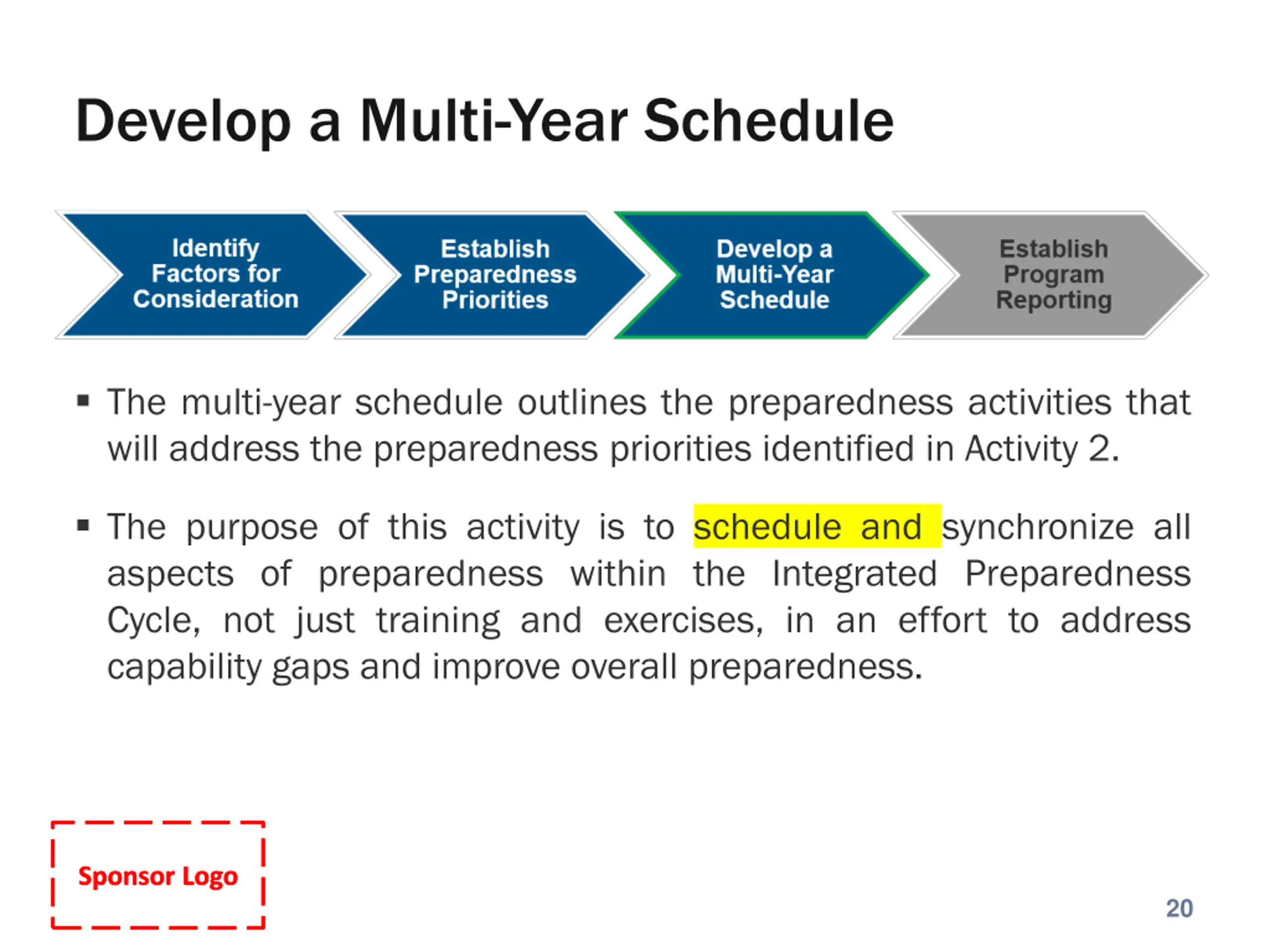 Develop a Multi-Year Schedule The multi-year schedule outlines the preparedness activities that will address the preparedness priorities identified in Activity 2. The purpose of this activity is to schedule and synchronize all aspects of preparedness within the Integrated Preparedness Cycle, not just training and exercises, in an effort to address capability gaps and improve overall preparedness. Sponsor Logo Sponsor Logo 20
