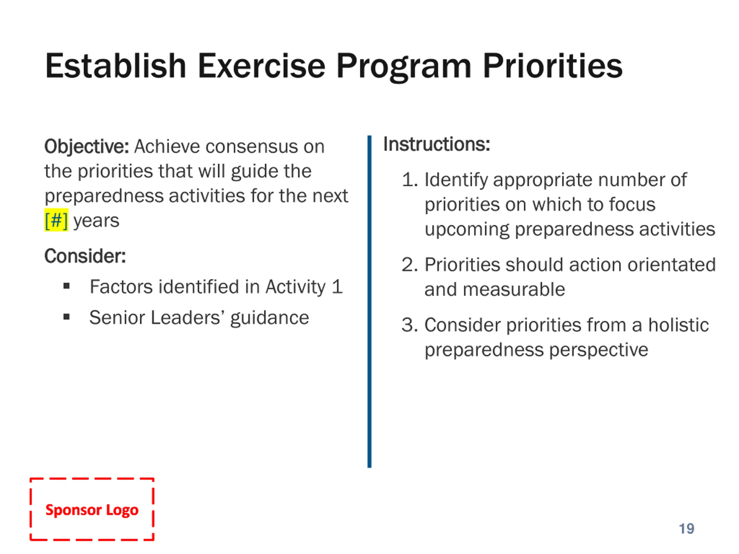 Establish Exercise Program Priorities Instructions: Instructions: Objective: Objective: Achieve consensus on the priorities that will guide the preparedness activities for the next [#] years 1. Identify appropriate number of priorities on which to focus upcoming preparedness activities Consider: Consider: Factors identified in Activity 1 Senior Leaders guidance 2. Priorities should action orientated and measurable 3. Consider priorities from a holistic preparedness perspective Sponsor Logo Sponsor Logo 19