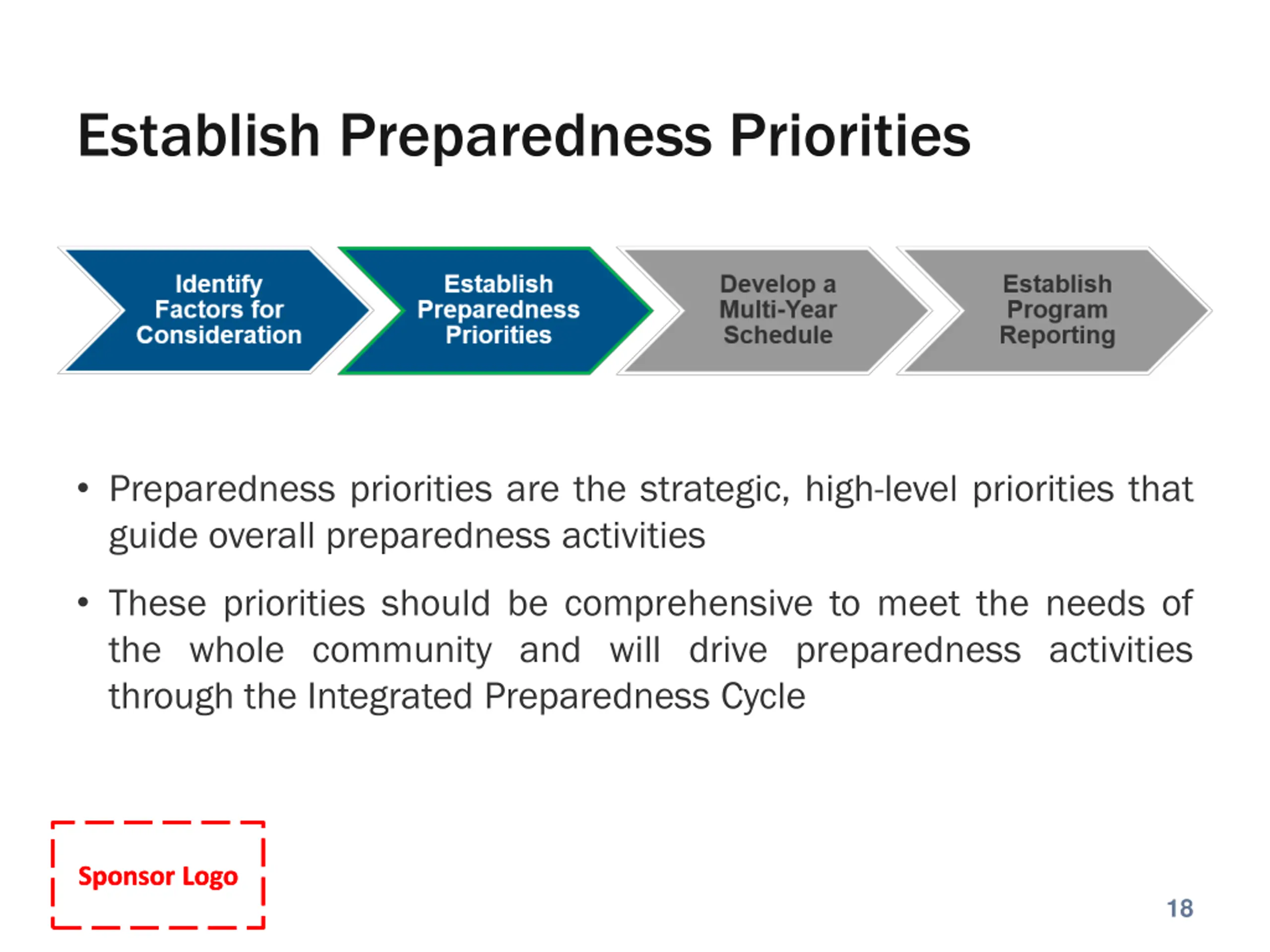 Establish Preparedness Priorities Preparedness priorities are the strategic, high-level priorities that guide overall preparedness activities These priorities should be comprehensive to meet the needs of the whole community and will drive preparedness activities through the Integrated Preparedness Cycle Sponsor Logo Sponsor Logo 18