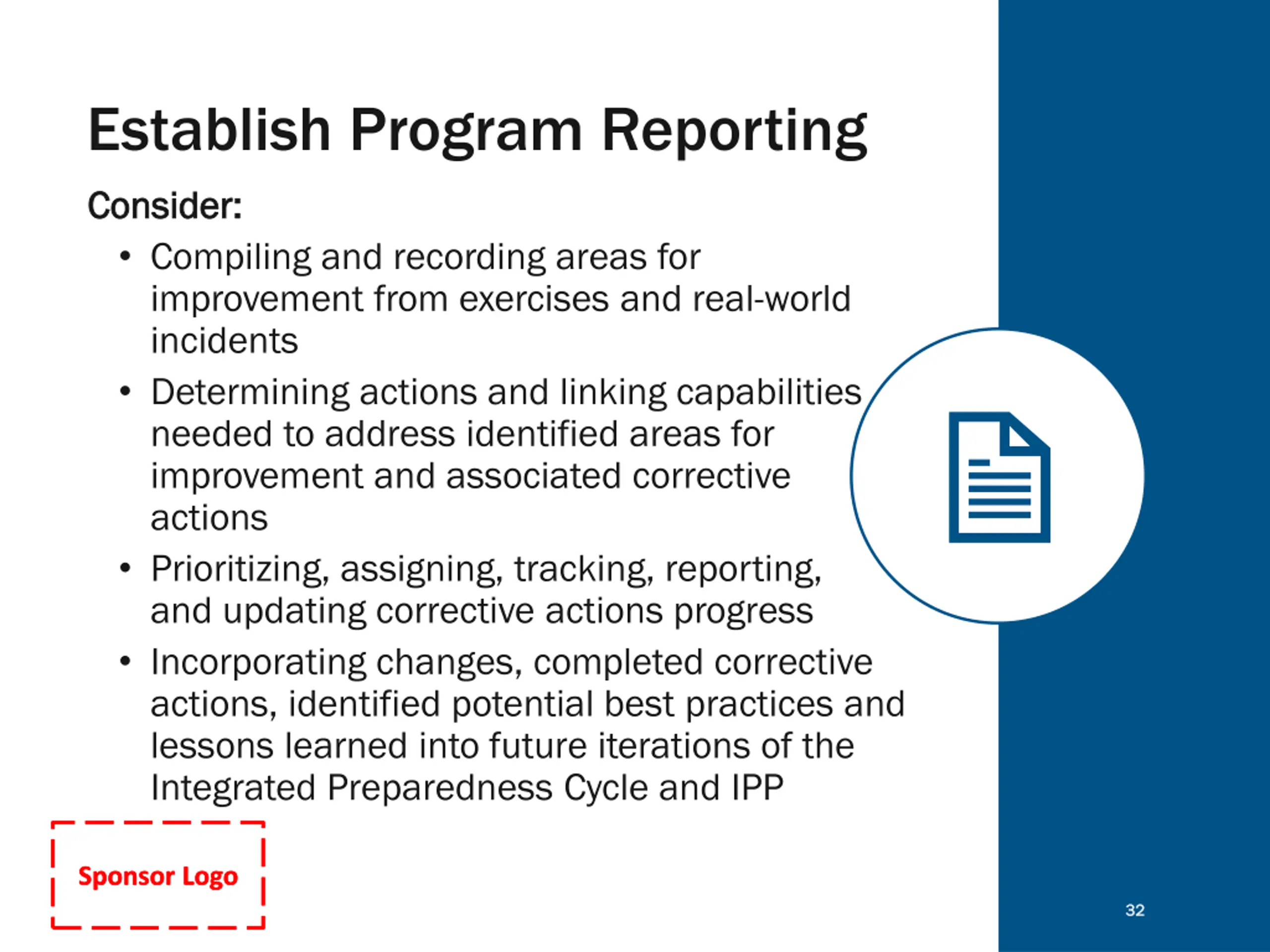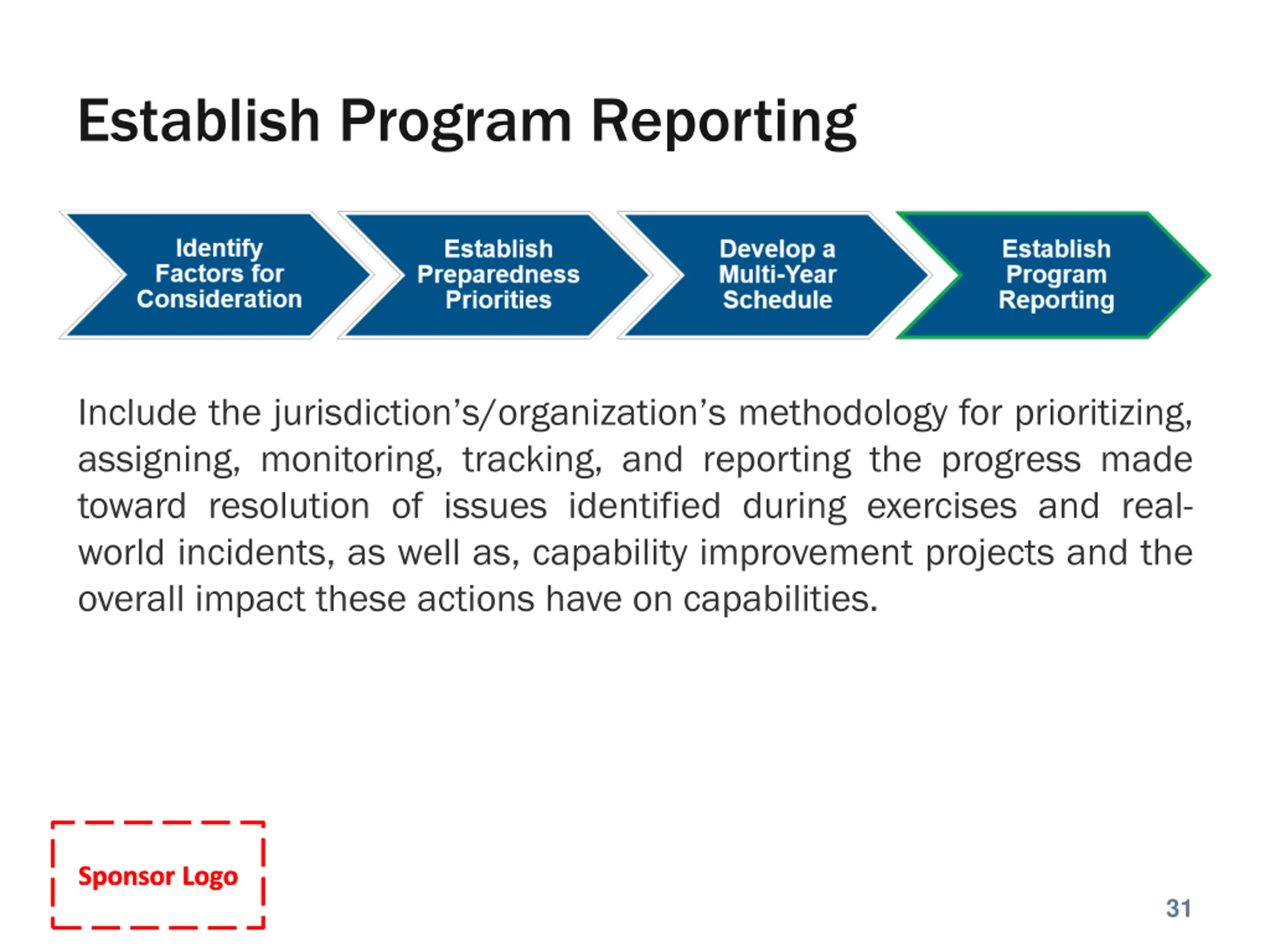 Establish Program Reporting Include the jurisdiction s/organization s methodology for prioritizing, assigning, monitoring, tracking, and reporting the progress made toward resolution of issues identified during exercises and real- world incidents, as well as, capability improvement projects and the overall impact these actions have on capabilities. Sponsor Logo Sponsor Logo 31