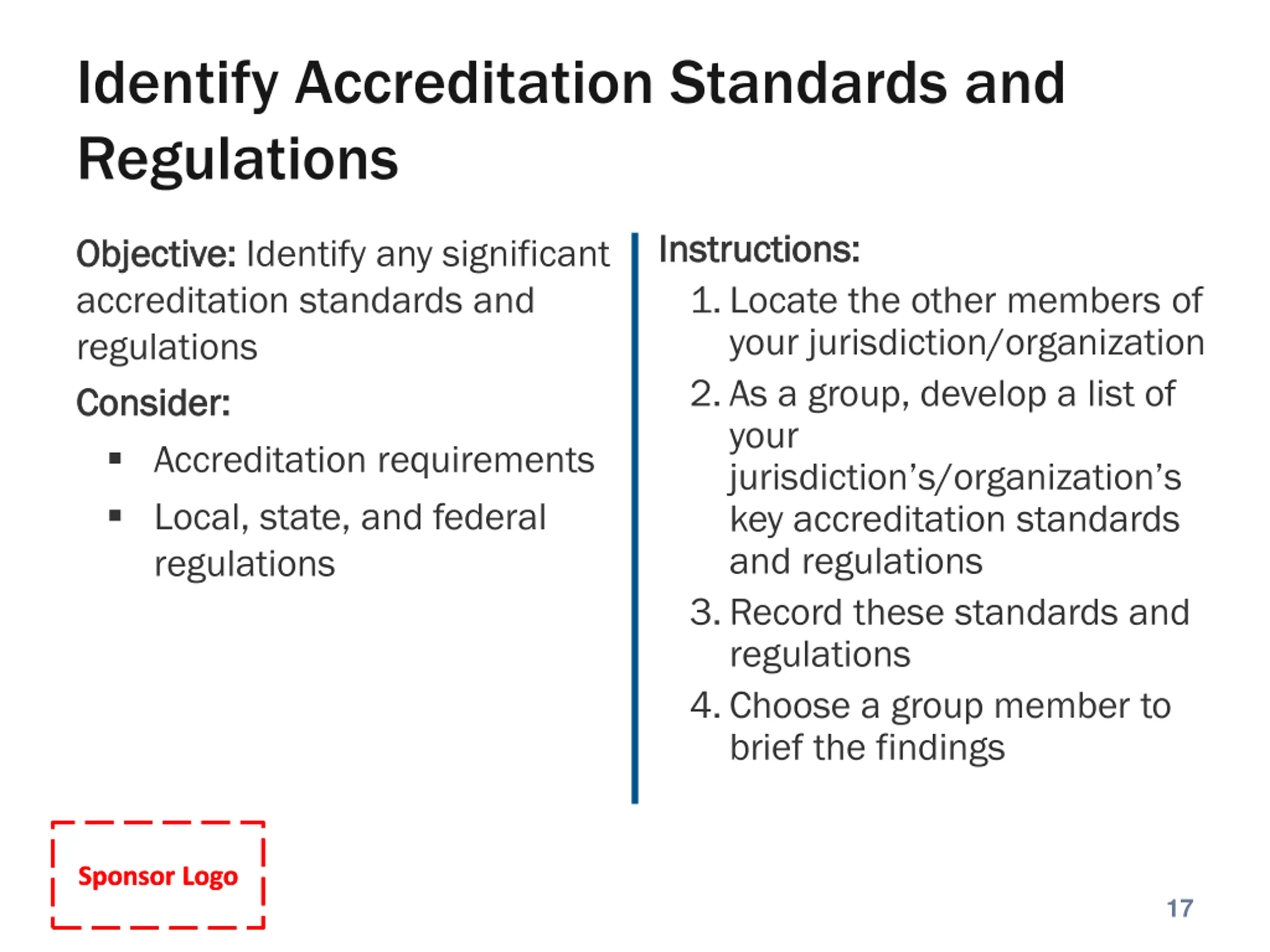 Identify Accreditation Standards and Regulations Instructions: Instructions: 1.Locate the other members of your jurisdiction/organization 2.As a group, develop a list of your jurisdiction s/organization s key accreditation standards and regulations 3.Record these standards and regulations 4.Choose a group member to brief the findings Objective: Objective: Identify any significant accreditation standards and regulations Consider: Consider: Accreditation requirements Local, state, and federal regulations Sponsor Logo Sponsor Logo 17
