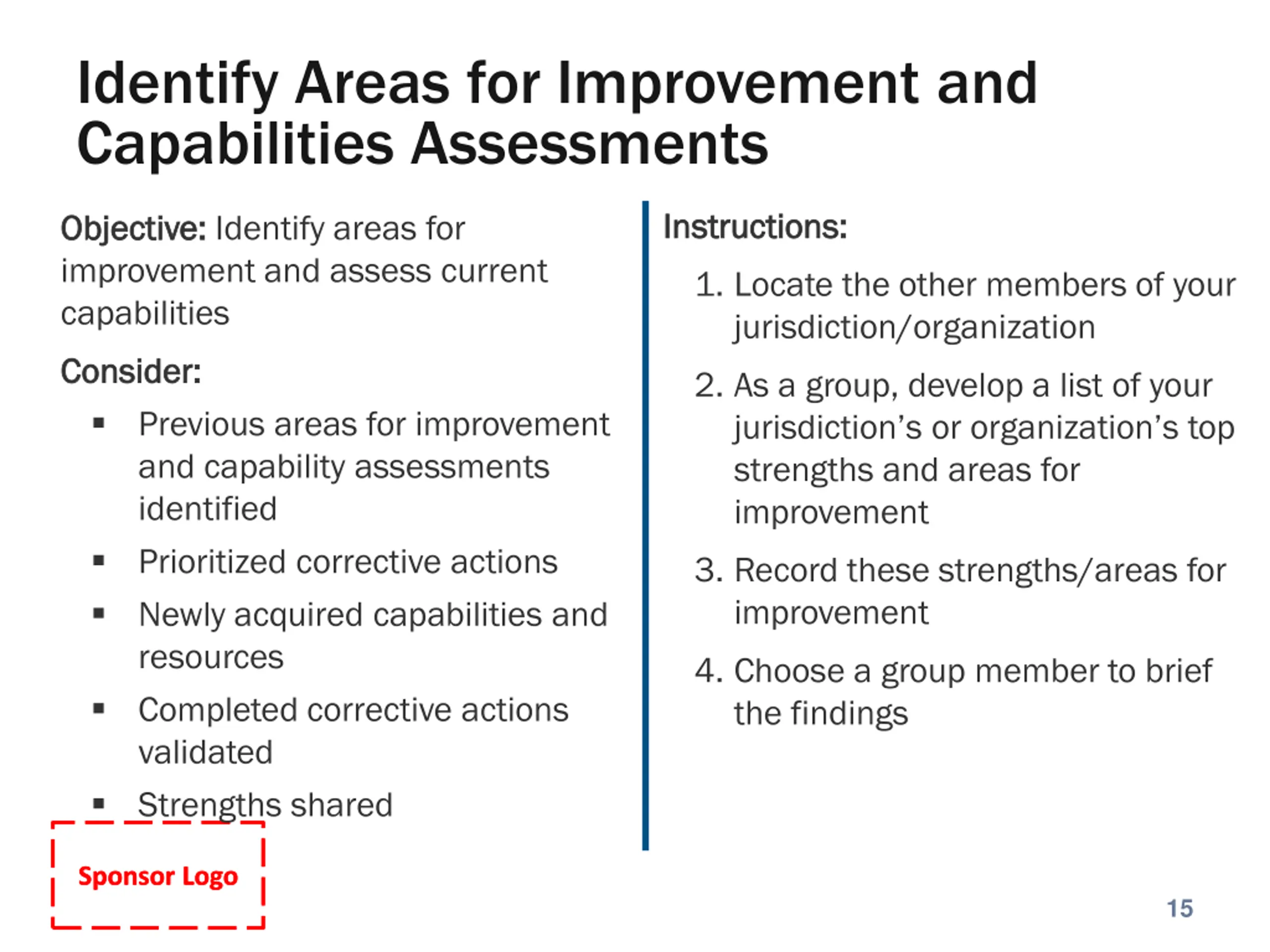 Identify Areas for Improvement and Capabilities Assessments Instructions: Instructions: Objective: Objective: Identify areas for improvement and assess current capabilities 1. Locate the other members of your jurisdiction/organization Consider: Consider: Previous areas for improvement and capability assessments identified Prioritized corrective actions Newly acquired capabilities and resources Completed corrective actions validated Strengths shared 2. As a group, develop a list of your jurisdiction s or organization s top strengths and areas for improvement 3. Record these strengths/areas for improvement 4. Choose a group member to brief the findings Sponsor Logo Sponsor Logo 15