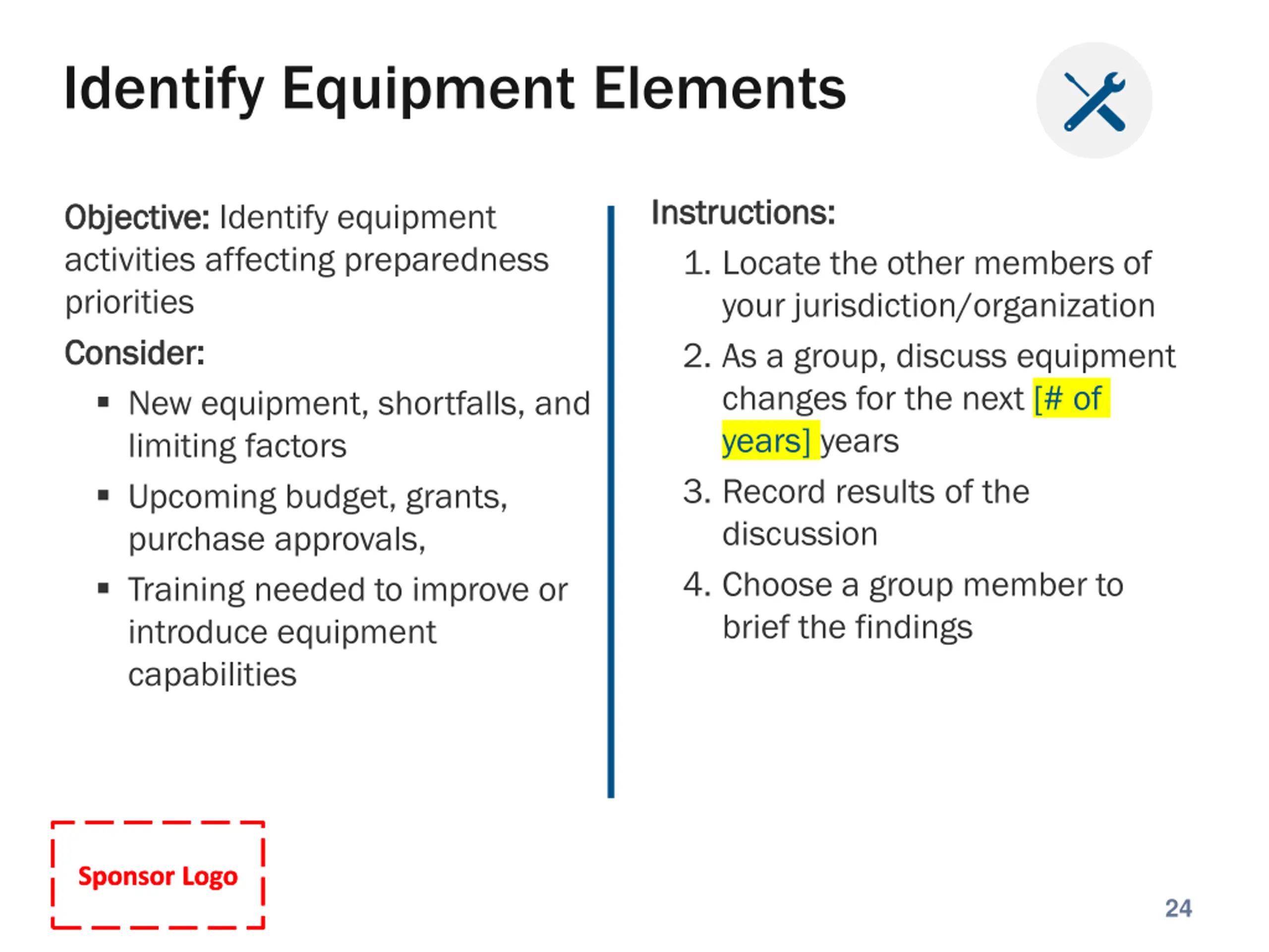 Identify Equipment Elements Instructions: Instructions: 1. Locate the other members of your jurisdiction/organization 2. As a group, discuss equipment changes for the next [# of years] years 3. Record results of the discussion 4. Choose a group member to brief the findings Objective: Objective: Identify equipment activities affecting preparedness priorities Consider: Consider: New equipment, shortfalls, and limiting factors Upcoming budget, grants, purchase approvals, Training needed to improve or introduce equipment capabilities Sponsor Logo Sponsor Logo 24