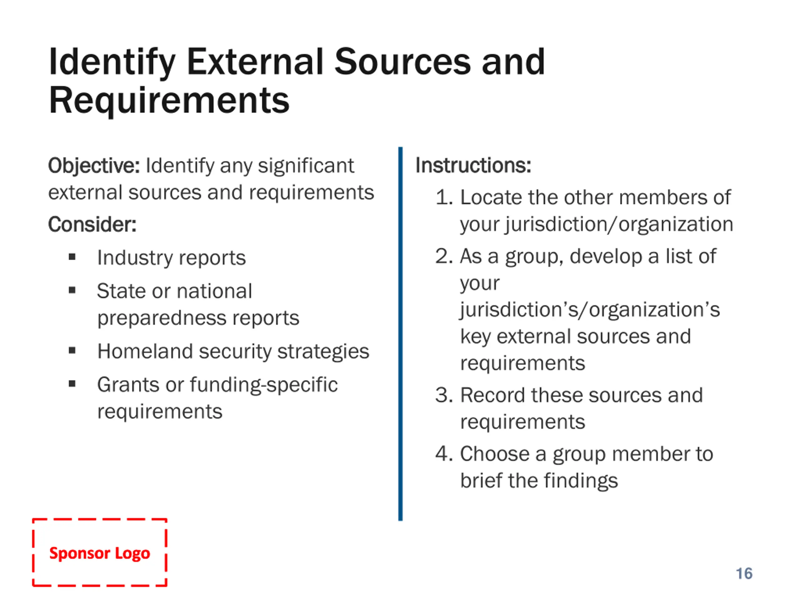 Identify External Sources and Requirements Instructions: Instructions: 1. Locate the other members of your jurisdiction/organization 2. As a group, develop a list of your jurisdiction s/organization s key external sources and requirements 3. Record these sources and requirements 4. Choose a group member to brief the findings Objective: Objective: Identify any significant external sources and requirements Consider: Consider: Industry reports State or national preparedness reports Homeland security strategies Grants or funding-specific requirements Sponsor Logo Sponsor Logo 16