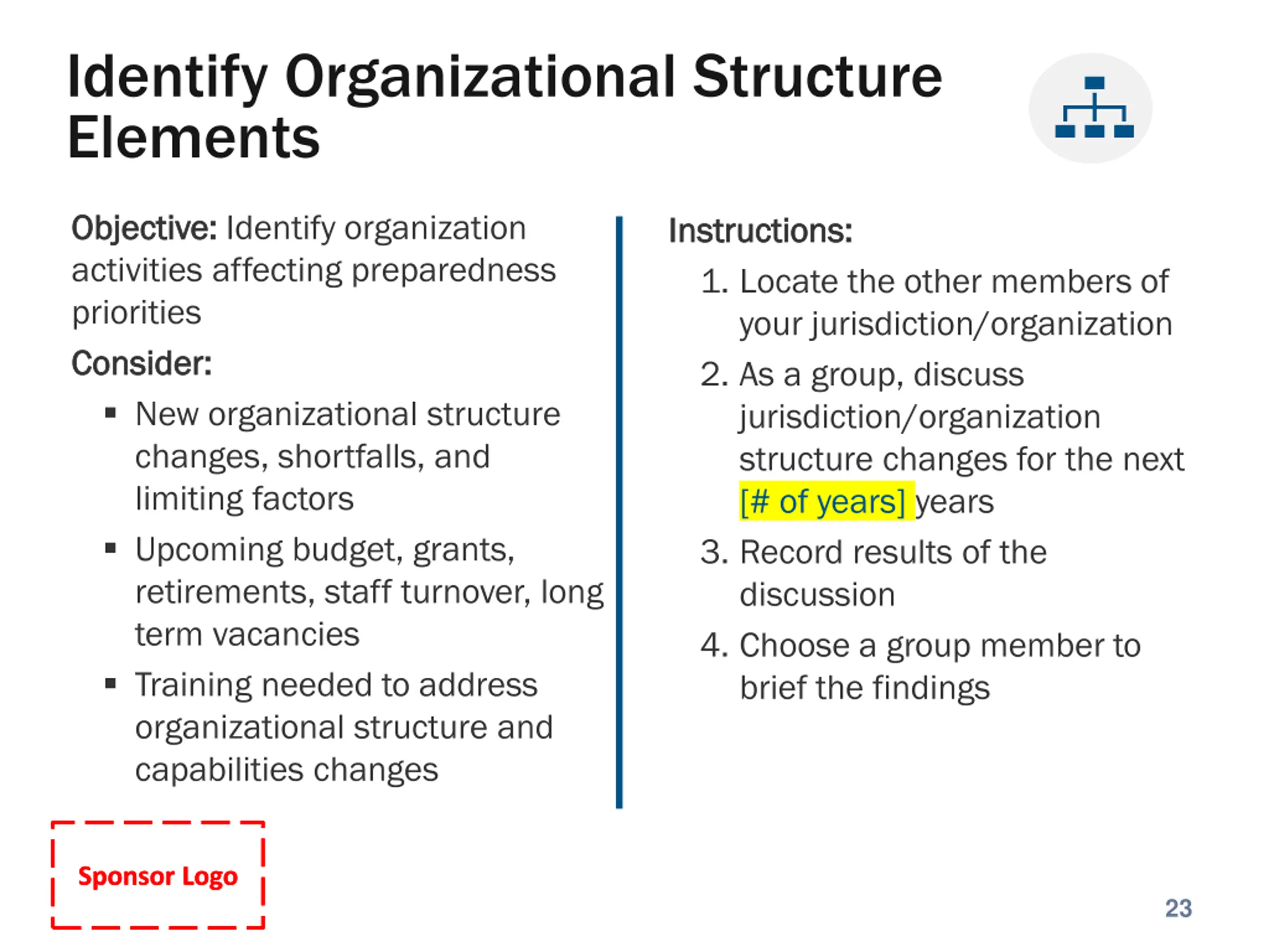 Identify Organizational Structure Elements Objective: Objective: Identify organization activities affecting preparedness priorities Consider: Consider: New organizational structure changes, shortfalls, and limiting factors Upcoming budget, grants, retirements, staff turnover, long term vacancies Training needed to address organizational structure and capabilities changes Instructions: Instructions: 1. Locate the other members of your jurisdiction/organization 2. As a group, discuss jurisdiction/organization structure changes for the next [# of years] years 3. Record results of the discussion 4. Choose a group member to brief the findings Sponsor Logo Sponsor Logo 23