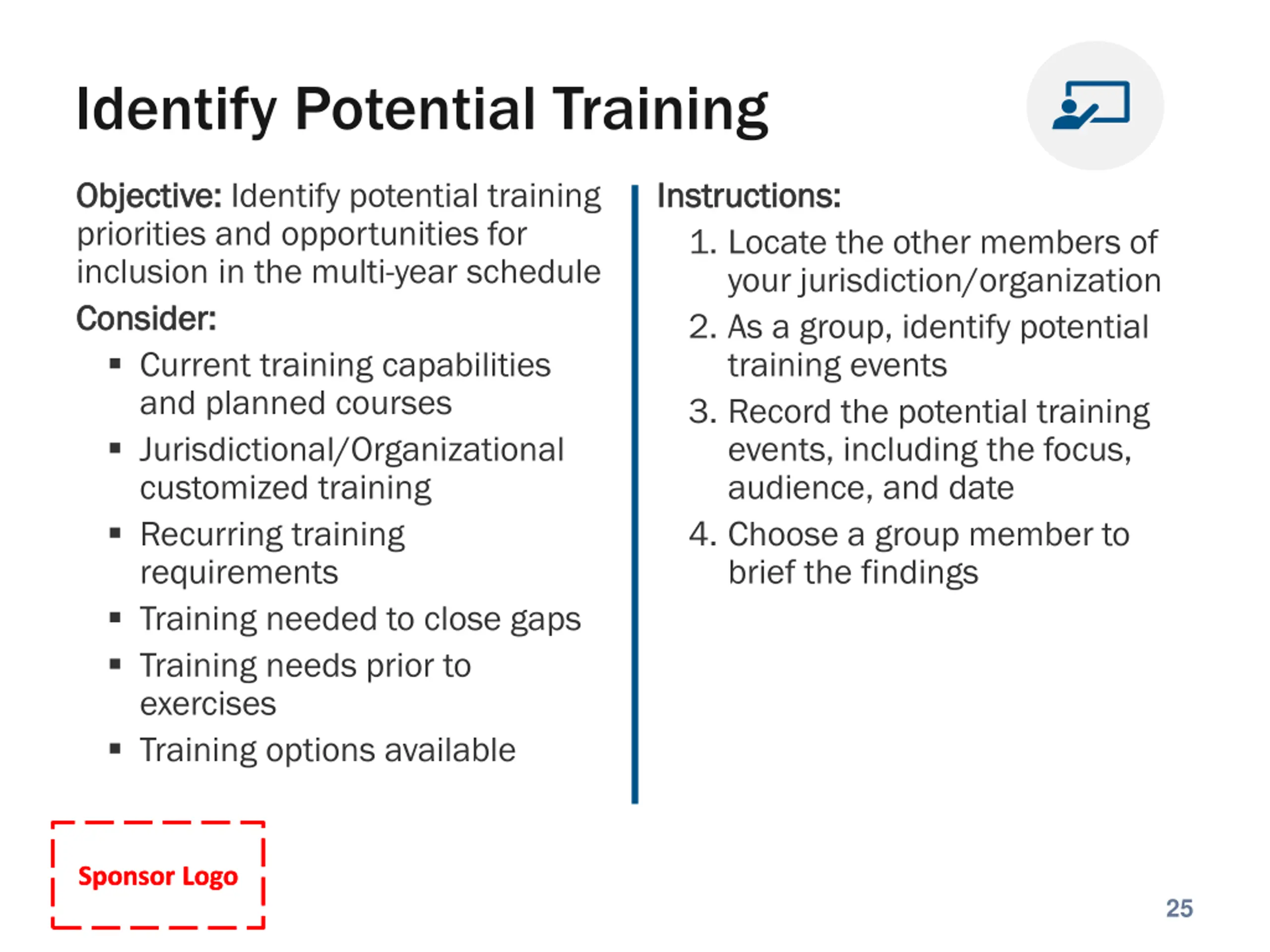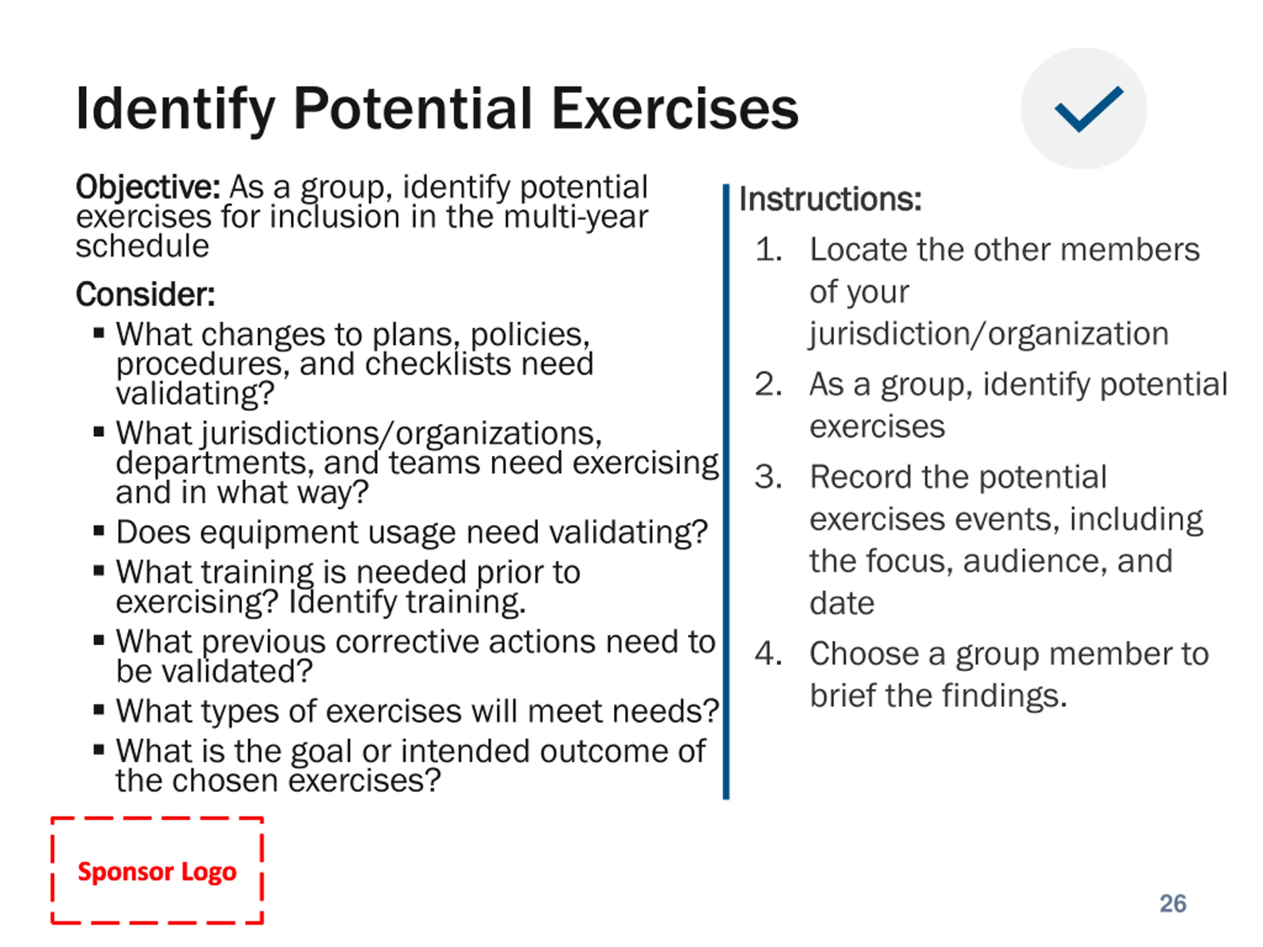 Identify Potential Training Objective: Objective: Identify potential training priorities and opportunities for inclusion in the multi-year schedule Consider: Consider: Current training capabilities and planned courses Jurisdictional/Organizational customized training Recurring training requirements Training needed to close gaps Training needs prior to exercises Training options available Instructions: Instructions: 1. Locate the other members of your jurisdiction/organization 2. As a group, identify potential training events 3. Record the potential training events, including the focus, audience, and date 4. Choose a group member to brief the findings Sponsor Logo Sponsor Logo 25