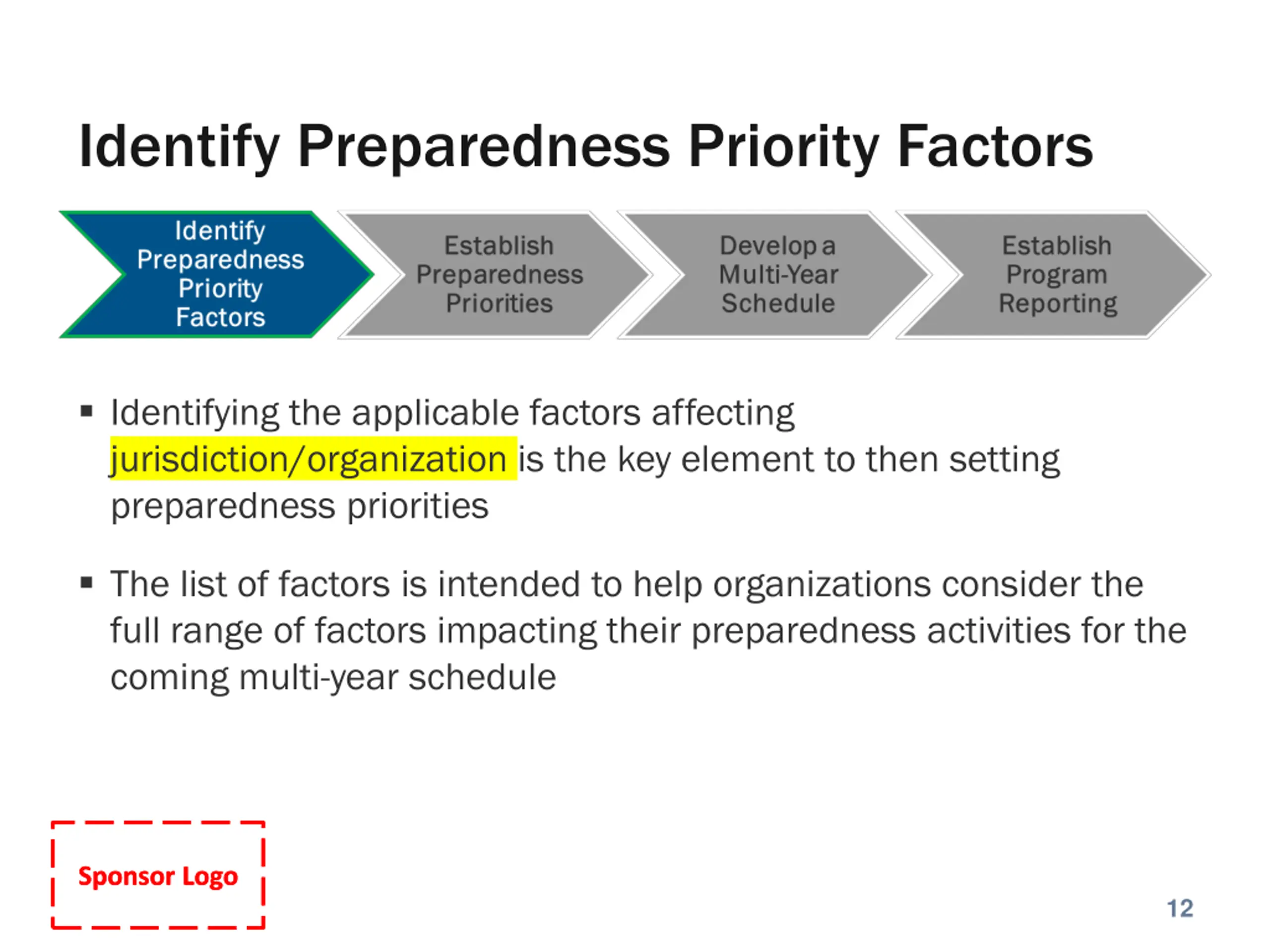 Identify Preparedness Priority Factors Identifying the applicable factors affecting jurisdiction/organization is the key element to then setting preparedness priorities The list of factors is intended to help organizations consider the full range of factors impacting their preparedness activities for the coming multi-year schedule Sponsor Logo Sponsor Logo 12