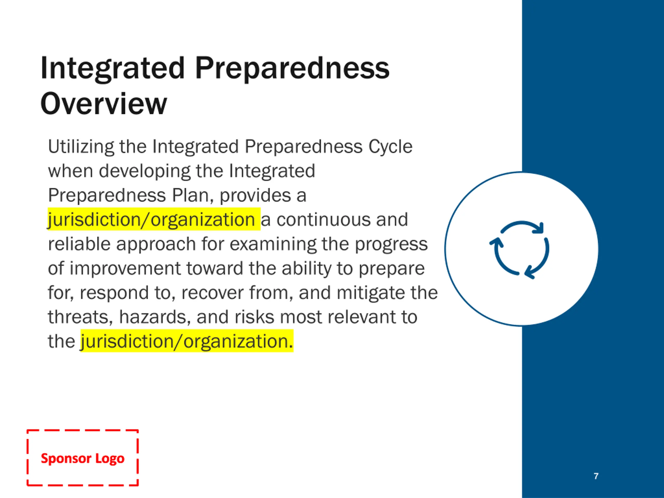 Integrated Preparedness Overview Utilizing the Integrated Preparedness Cycle when developing the Integrated Preparedness Plan, provides a jurisdiction/organization a continuous and reliable approach for examining the progress of improvement toward the ability to prepare for, respond to, recover from, and mitigate the threats, hazards, and risks most relevant to the jurisdiction/organization. Sponsor Logo Sponsor Logo 7
