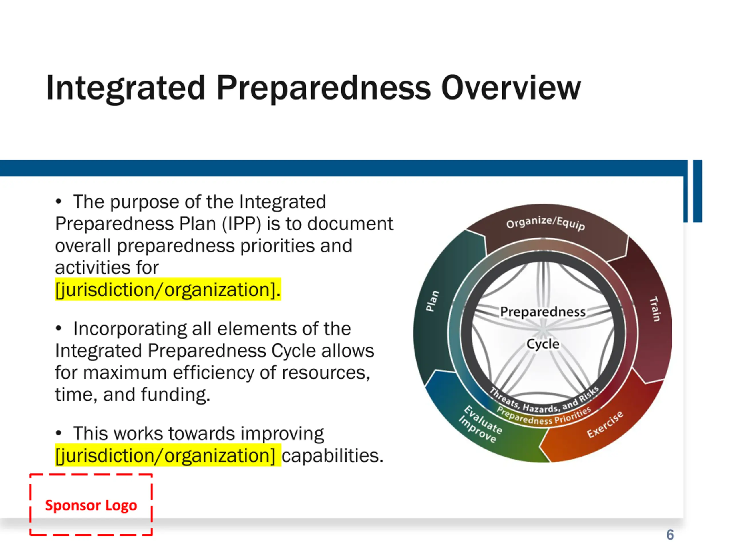 Attendee Expectations Have a working knowledge of their jurisdiction s/organization s capabilities, threats and hazards, and other priority factors Working Knowledge Bring a list of their jurisdiction s/organization s currently scheduled preparedness activities Bring a List Authority to Commit Have authority to commit personnel and resources to the activities scheduled in the Integrated Preparedness Plan Actively Participate Actively participate in workshop discussions as a representative for their jurisdiction/organization Sponsor Logo Sponsor Logo 5