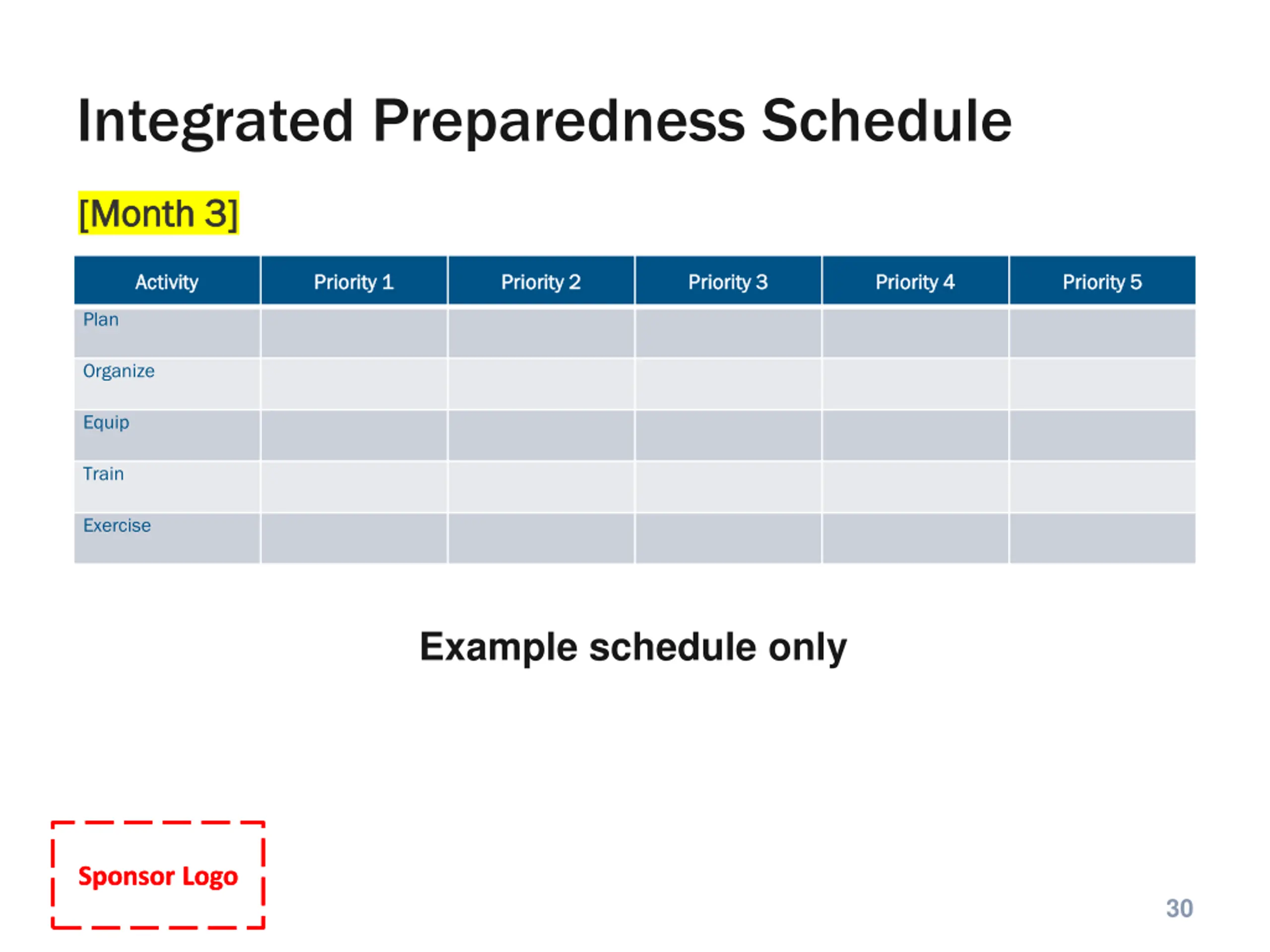 Integrated Preparedness Schedule [Month 3] [Month 3] Activity Activity Priority Priority 1 1 Priority Priority 2 2 Priority Priority 3 3 Priority Priority 4 4 Priority Priority 5 5 Plan Organize Equip Train Exercise Example schedule only Sponsor Logo Sponsor Logo 30