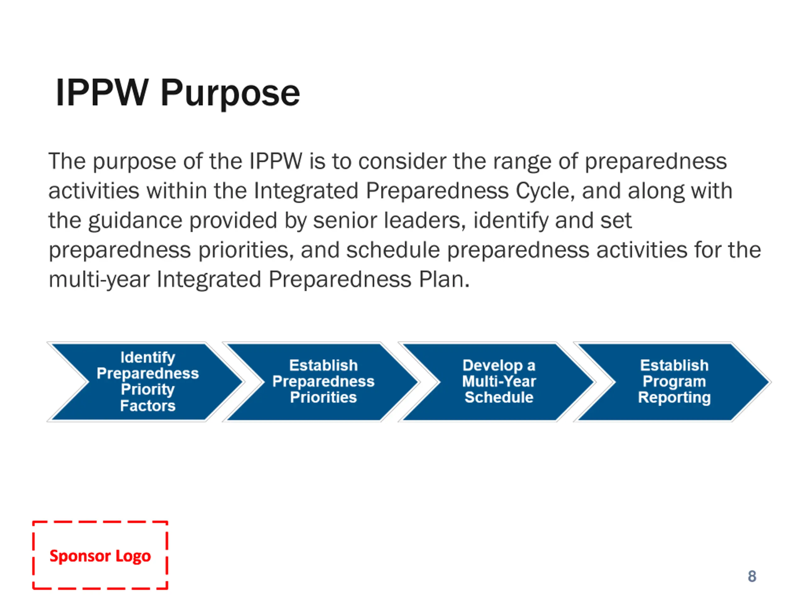 IPPW Purpose The purpose of the IPPW is to consider the range of preparedness activities within the Integrated Preparedness Cycle, and along with the guidance provided by senior leaders, identify and set preparedness priorities, and schedule preparedness activities for the multi-year Integrated Preparedness Plan. Sponsor Logo Sponsor Logo 8