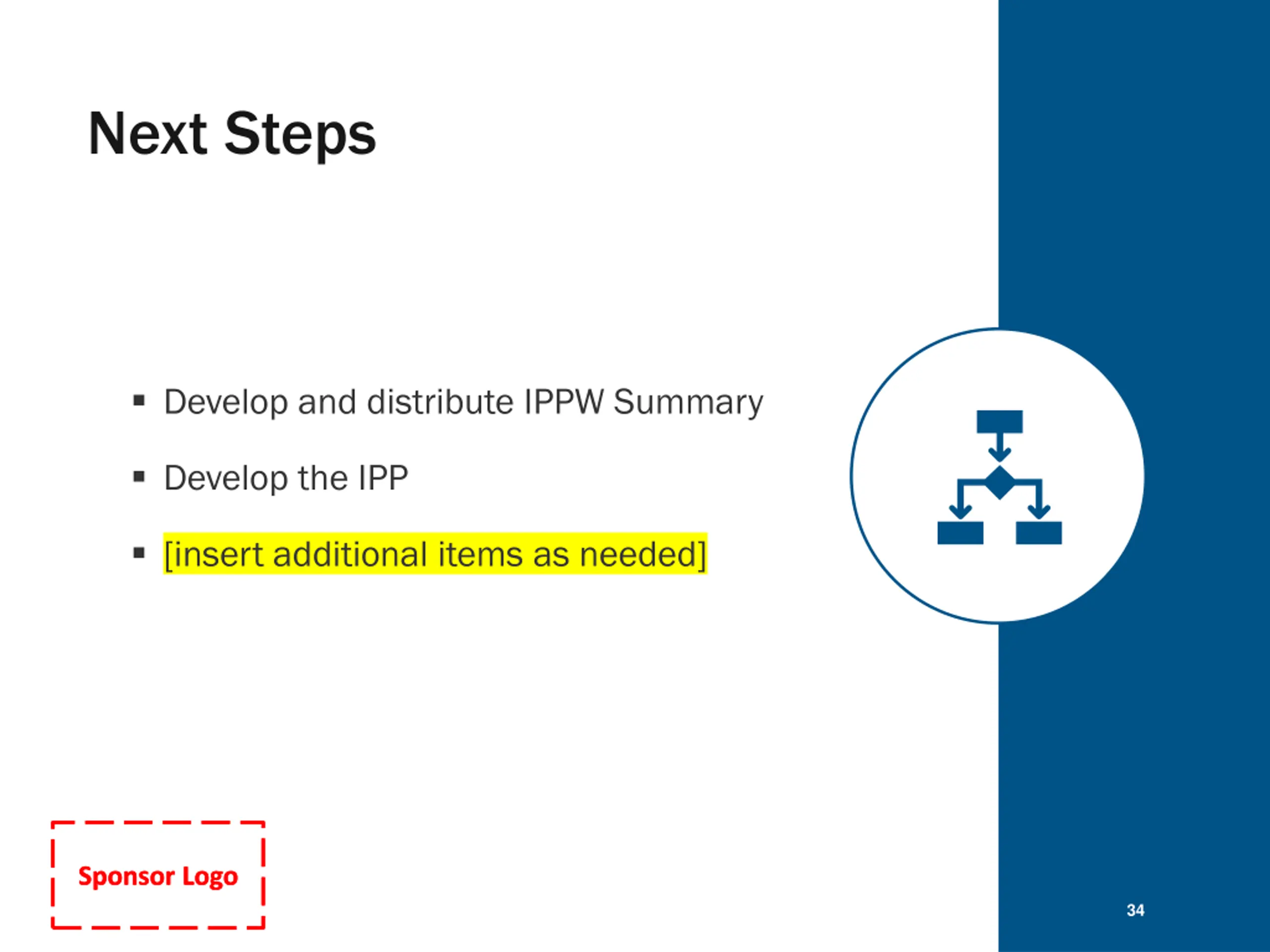 Next Steps Develop and distribute IPPW Summary Develop the IPP [insert additional items as needed] Sponsor Logo Sponsor Logo 34