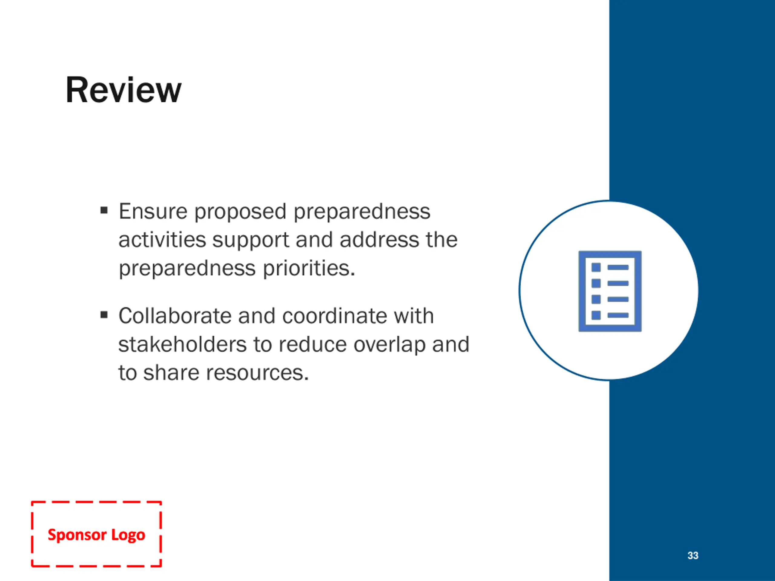 Review Ensure proposed preparedness activities support and address the preparedness priorities. Collaborate and coordinate with stakeholders to reduce overlap and to share resources. Sponsor Logo Sponsor Logo 33