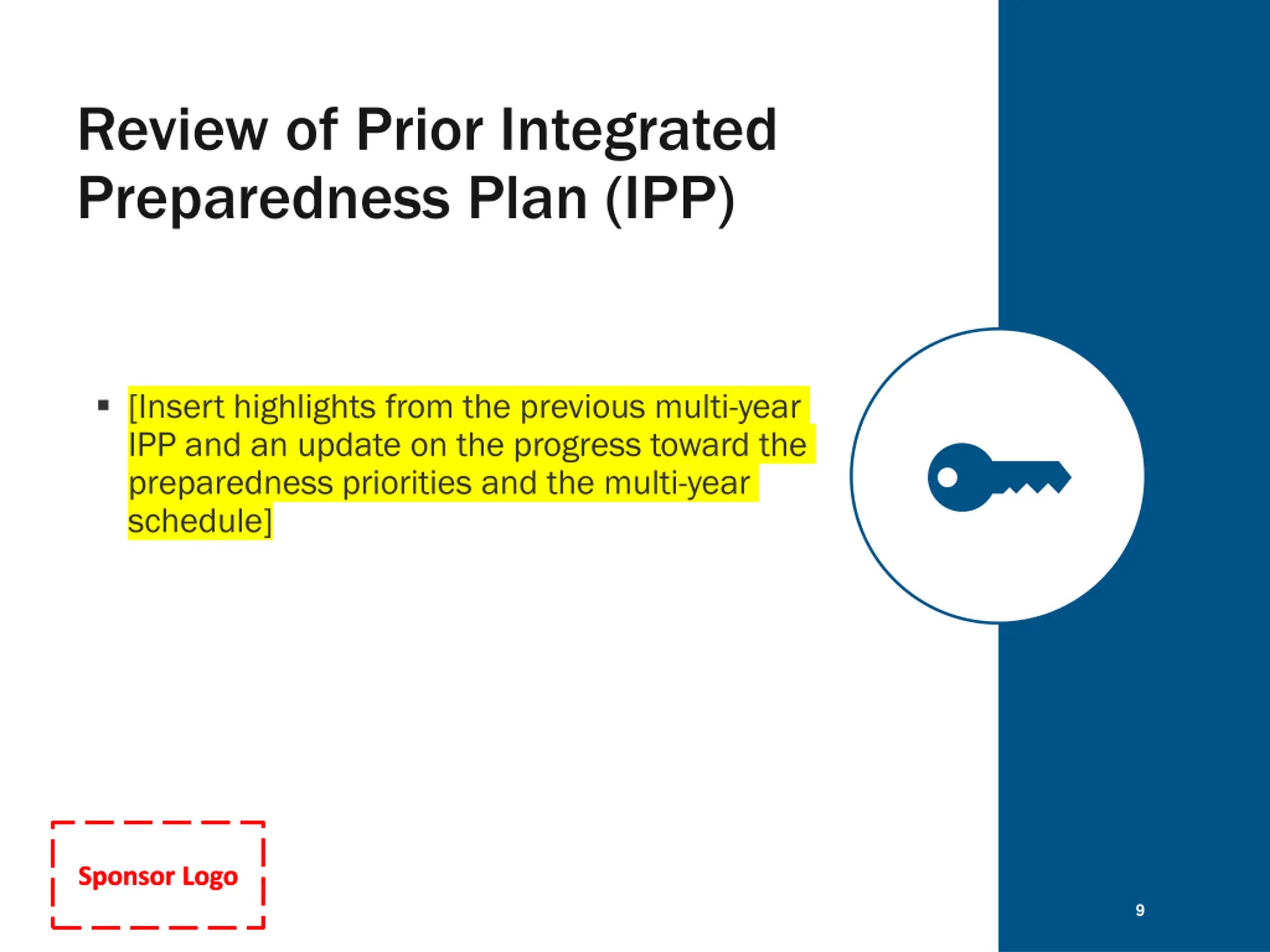 Review of Prior Integrated Preparedness Plan (IPP) [Insert highlights from the previous multi-year IPP and an update on the progress toward the preparedness priorities and the multi-year schedule] Sponsor Logo Sponsor Logo 9