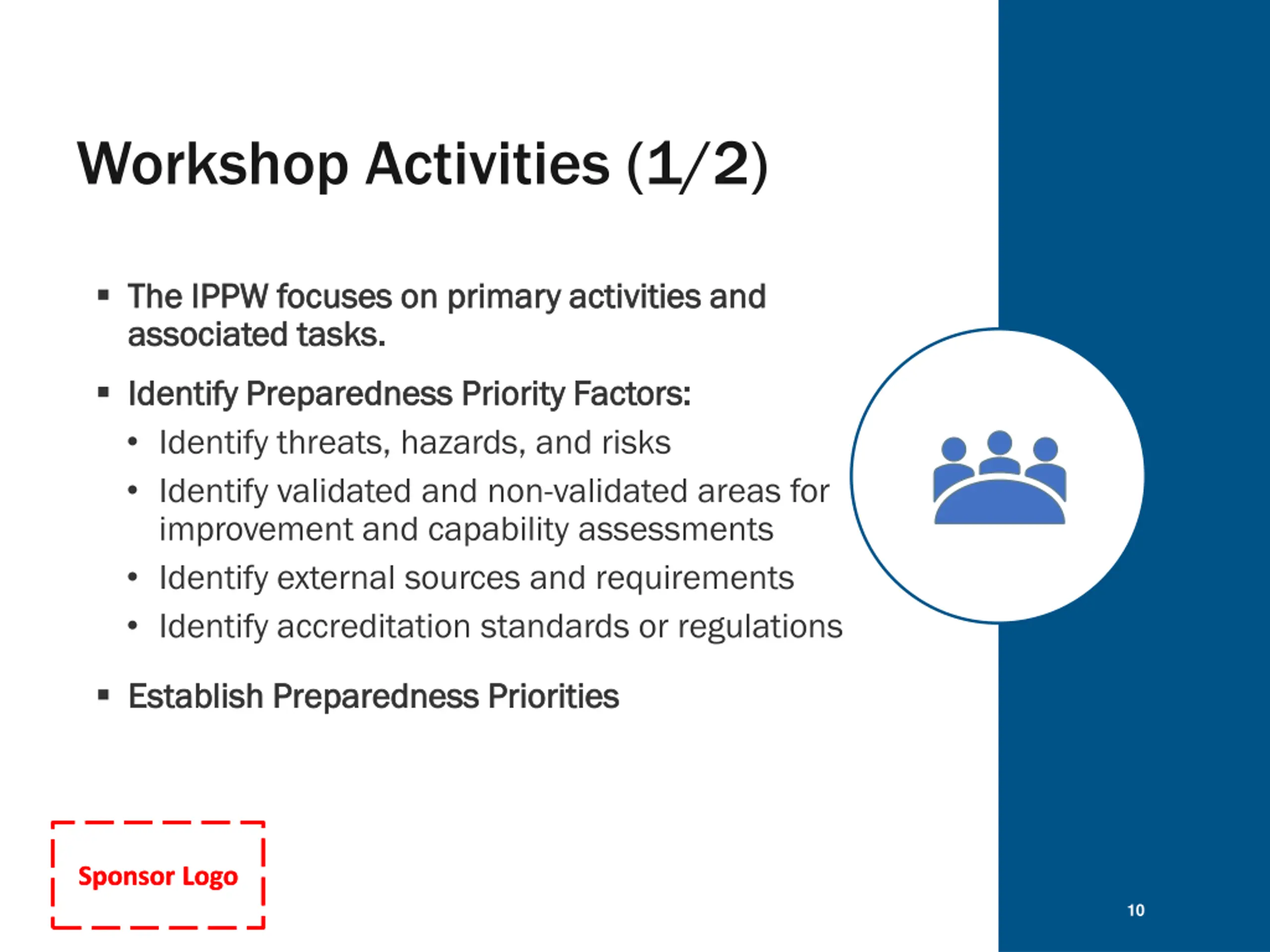 Workshop Activities (1/2) The IPPW focuses on primary activities and The IPPW focuses on primary activities and associated tasks. associated tasks. Identify Preparedness Priority Factors: Identify Preparedness Priority Factors: Identify threats, hazards, and risks Identify validated and non-validated areas for improvement and capability assessments Identify external sources and requirements Identify accreditation standards or regulations Establish Preparedness Priorities Establish Preparedness Priorities Sponsor Logo Sponsor Logo 10