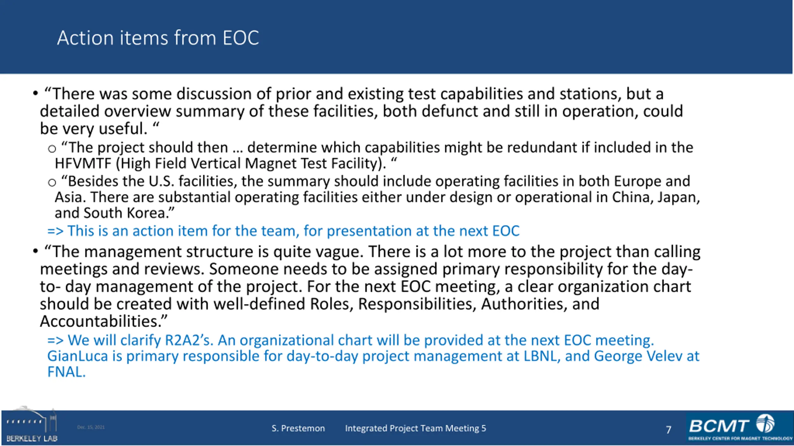 Action items from EOC There was some discussion of prior and existing test capabilities and stations, but a detailed overview summary of these facilities, both defunct and still in operation, could be very useful. o The project should then determine which capabilities might be redundant if included in the HFVMTF (High Field Vertical Magnet Test Facility). o Besides the U.S. facilities, the summary should include operating facilities in both Europe and Asia. There are substantial operating facilities either under design or operational in China, Japan, and South Korea. => This is an action item for the team, for presentation at the next EOC The management structure is quite vague. There is a lot more to the project than calling meetings and reviews. Someone needs to be assigned primary responsibility for the day- to- day management of the project. For the next EOC meeting, a clear organization chart should be created with well-defined Roles, Responsibilities, Authorities, and Accountabilities. => We will clarify R2A2 s. An organizational chart will be provided at the next EOC meeting. GianLuca is primary responsible for day-to-day project management at LBNL, and George Velev at FNAL. S. Prestemon Integrated Project Team Meeting 5 7 Dec. 15, 2021