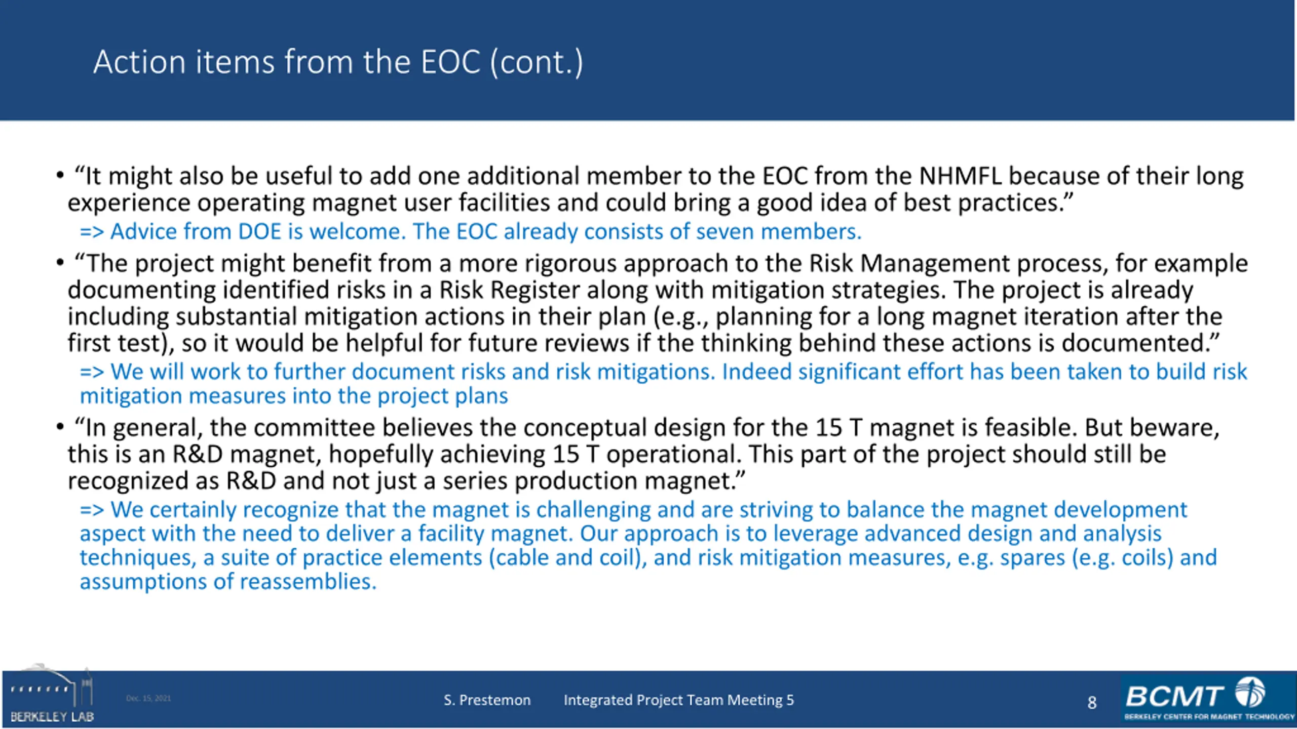 Action items from the EOC (cont.) It might also be useful to add one additional member to the EOC from the NHMFL because of their long experience operating magnet user facilities and could bring a good idea of best practices. => Advice from DOE is welcome. The EOC already consists of seven members. The project might benefit from a more rigorous approach to the Risk Management process, for example documenting identified risks in a Risk Register along with mitigation strategies. The project is already including substantial mitigation actions in their plan (e.g., planning for a long magnet iteration after the first test), so it would be helpful for future reviews if the thinking behind these actions is documented. => We will work to further document risks and risk mitigations. Indeed significant effort has been taken to build risk mitigation measures into the project plans In general, the committee believes the conceptual design for the 15 T magnet is feasible. But beware, this is an R&D magnet, hopefully achieving 15 T operational. This part of the project should still be recognized as R&D and not just a series production magnet. => We certainly recognize that the magnet is challenging and are striving to balance the magnet development aspect with the need to deliver a facility magnet. Our approach is to leverage advanced design and analysis techniques, a suite of practice elements (cable and coil), and risk mitigation measures, e.g. spares (e.g. coils) and assumptions of reassemblies. S. Prestemon Integrated Project Team Meeting 5 8 Dec. 15, 2021