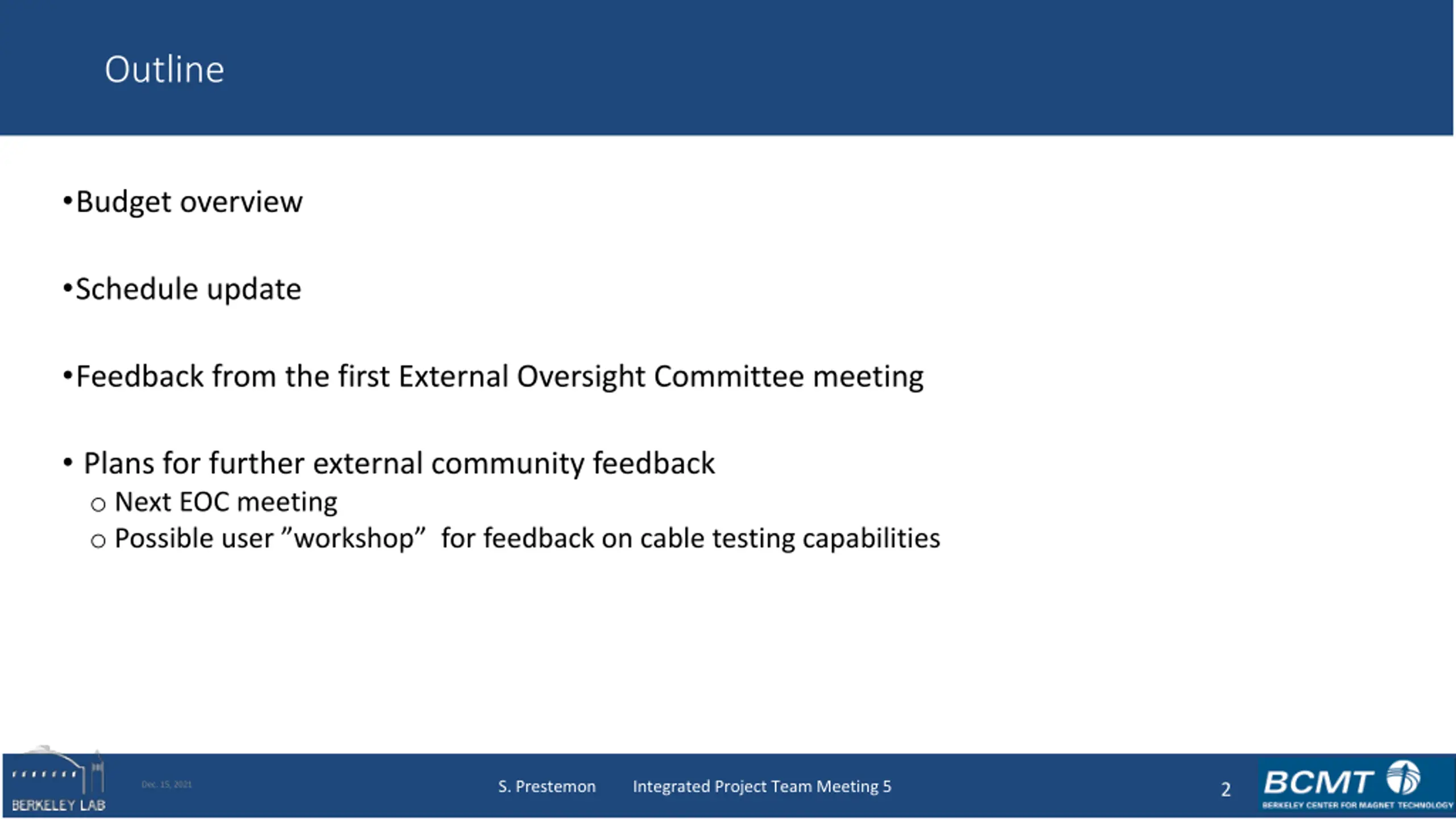 Outline Budget overview Schedule update Feedback from the first External Oversight Committee meeting Plans for further external community feedback o Next EOC meeting o Possible user workshop for feedback on cable testing capabilities S. Prestemon Integrated Project Team Meeting 5 2 Dec. 15, 2021