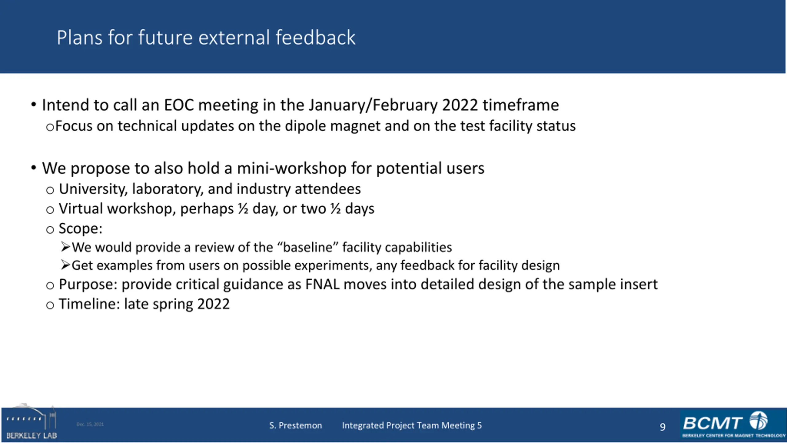 Plans for future external feedback Intend to call an EOC meeting in the January/February 2022 timeframe oFocus on technical updates on the dipole magnet and on the test facility status We propose to also hold a mini-workshop for potential users o University, laboratory, and industry attendees o Virtual workshop, perhaps day, or two days o Scope: We would provide a review of the baseline facility capabilities Get examples from users on possible experiments, any feedback for facility design o Purpose: provide critical guidance as FNAL moves into detailed design of the sample insert o Timeline: late spring 2022 S. Prestemon Integrated Project Team Meeting 5 9 Dec. 15, 2021