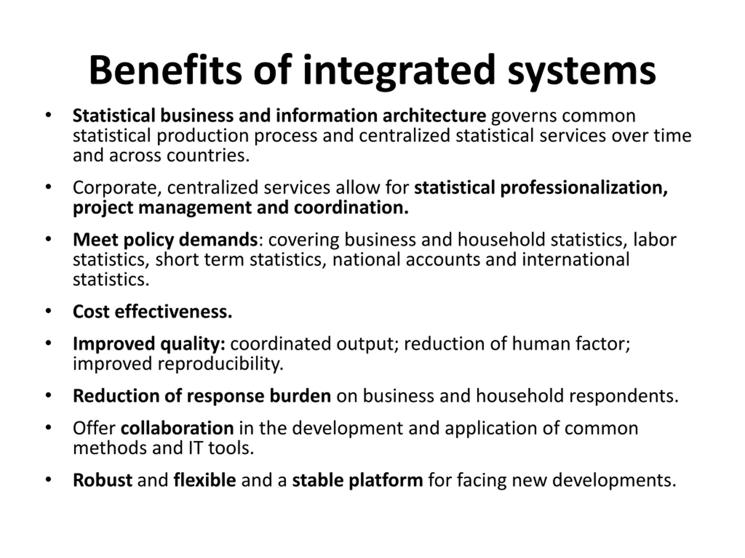 Benefits of integrated systems Statistical business and information architecture governs common statistical production process and centralized statistical services over time and across countries. Corporate, centralized services allow for statistical professionalization, project management and coordination. Meet policy demands: covering business and household statistics, labor statistics, short term statistics, national accounts and international statistics. Cost effectiveness. Improved quality: coordinated output; reduction of human factor; improved reproducibility. Reduction of response burden on business and household respondents. Offer collaboration in the development and application of common methods and IT tools. Robust and flexible and a stable platform for facing new developments.