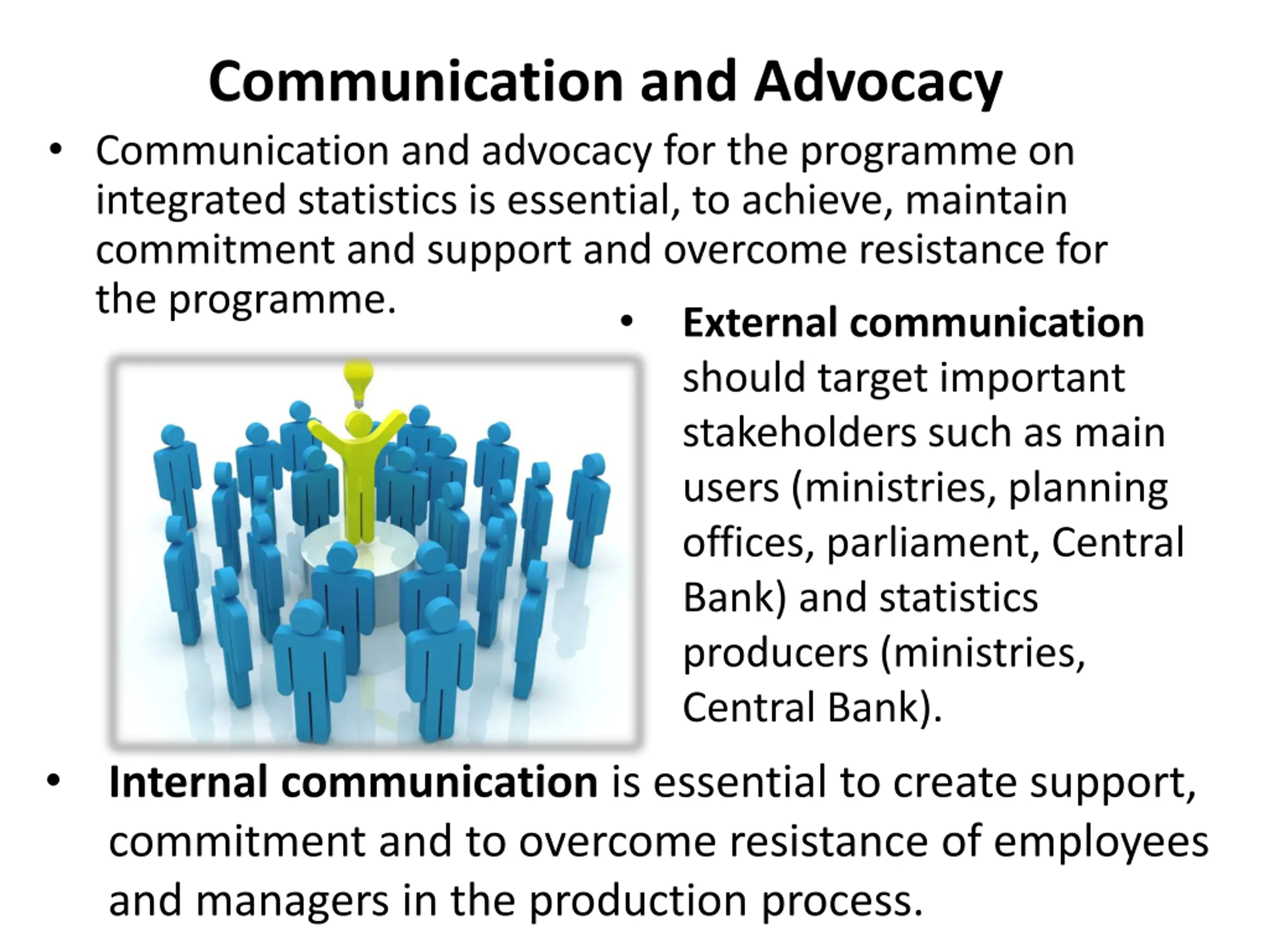 Communication and Advocacy Communication and advocacy for the programme on integrated statistics is essential, to achieve, maintain commitment and support and overcome resistance for the programme. External communication should target important stakeholders such as main users (ministries, planning offices, parliament, Central Bank) and statistics producers (ministries, Central Bank). Internal communication is essential to create support, commitment and to overcome resistance of employees and managers in the production process.